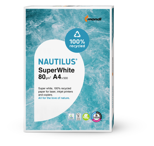 Nautilus SuperWhite 100% Recycled–Мультифункциональная офисная бумага марки A, формат А4 изготовленная из 100% переработанного сырья. Используя бумагу премиум класса Nautilus Super White можно заботиться о природе без экономии на качестве. Бумага обладает высокой белизной и непрозрачностью идеально подходит для любого офисного оборудования—лазерных и струйных принтеров (произведена с технологией ColorLok), копировальных и факсимильных аппаратов. Рекомендована ведущими производителями офисной техники.