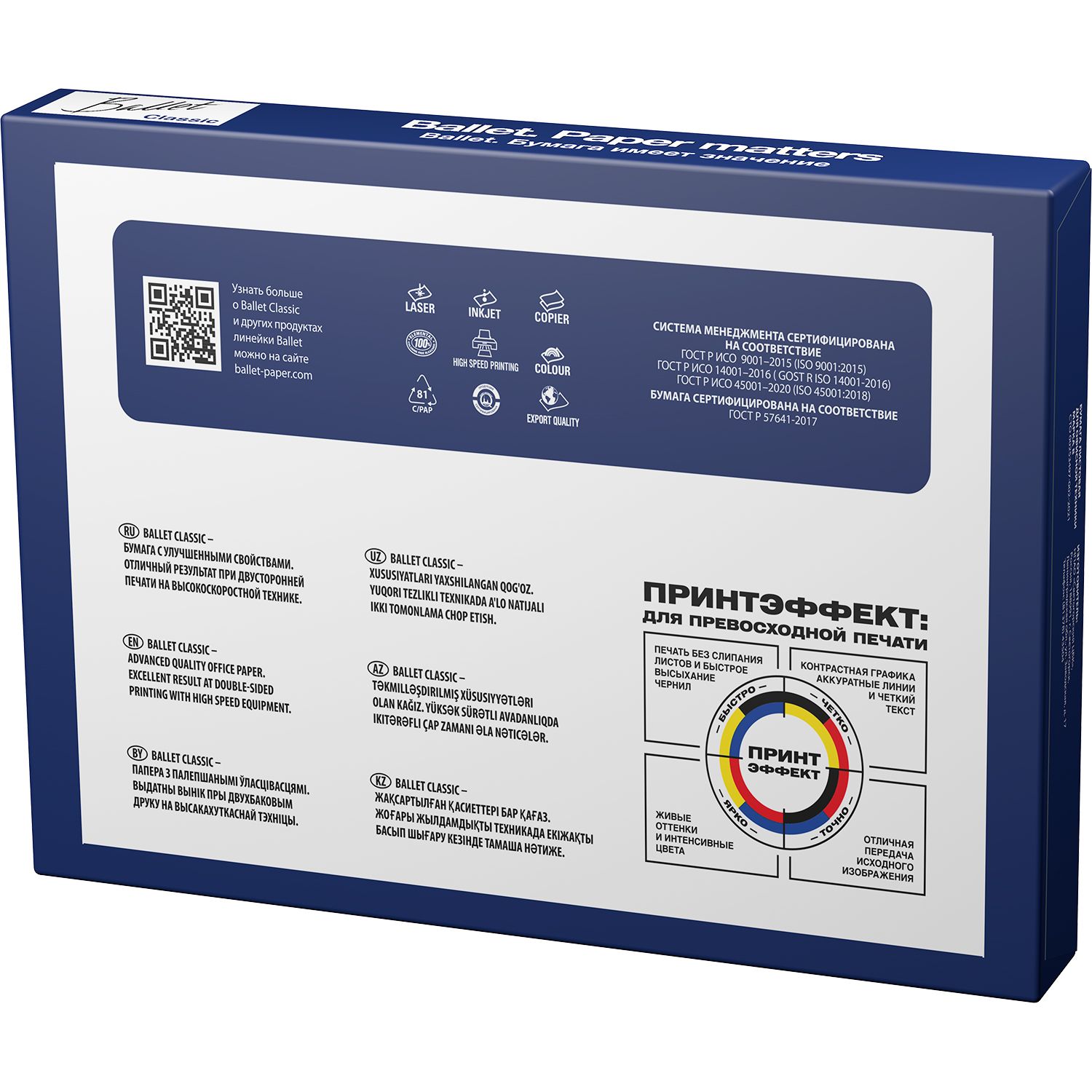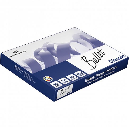 Бумага Ballet Classic относится к марке «B», сертифицирована по ГОСТ Р 57641-2017. Граммаж составляет 80 г/м², толщина – 104 микрон, белизна – 153% (CIE). Не содержит элементарного хлора.