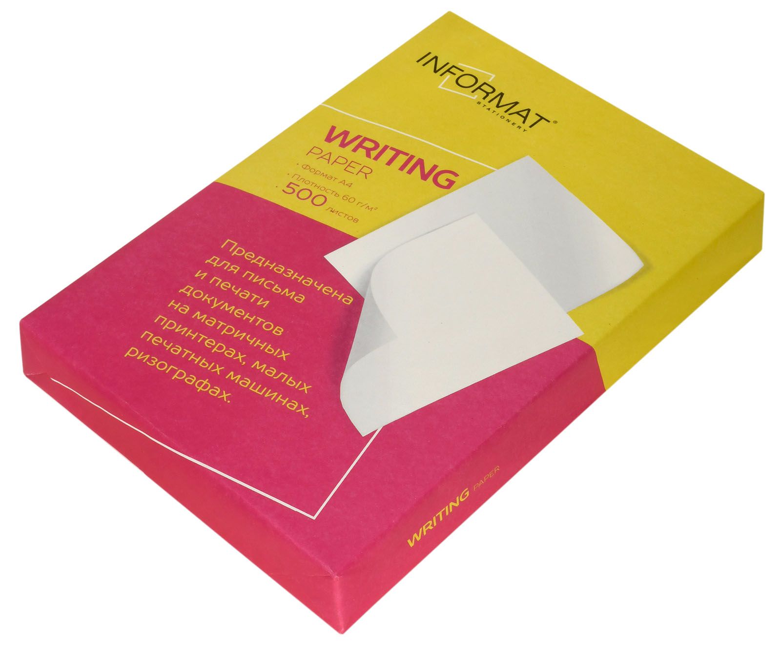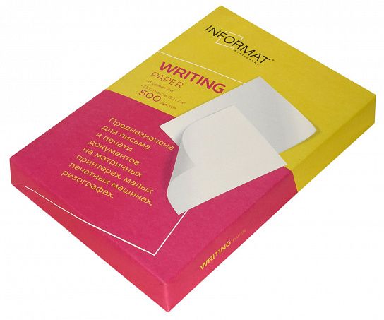 Эта писчая бумага рекомендуется для использования на механическом, офсетном и электрическом печатном оборудовании, а также для матричных принтеров. Плотность бумаги 60 г/м2.