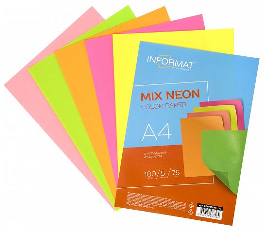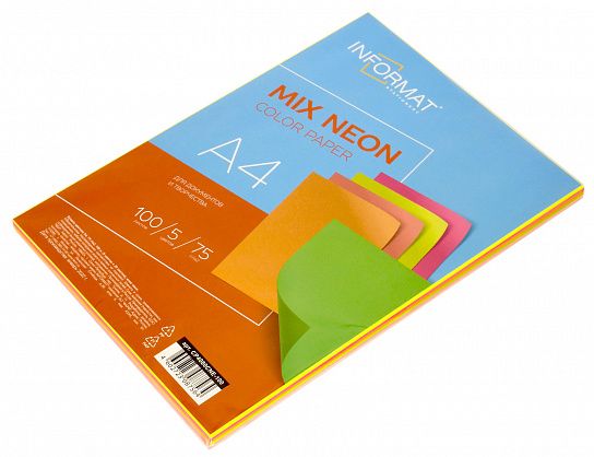 Востребованный расходный материал, предназначенный для повседневного использования в офисах и других организациях. Бумага цветная INFORMAT NEON MIX 5 цветов по 20 л. (75 г/м2, А4) отличается высоким качеством и хорошей плотностью, обеспечивает четкий перенос текста и изображения (цветного и ч/б). Чернила не смазываются, быстро проникают в текстуру и сохнут. Листы имеют четкую правильную форму, удобны в работе. Продукция соответствует требованиям ГОСТов, не содержит вредных токсичных добавок.
