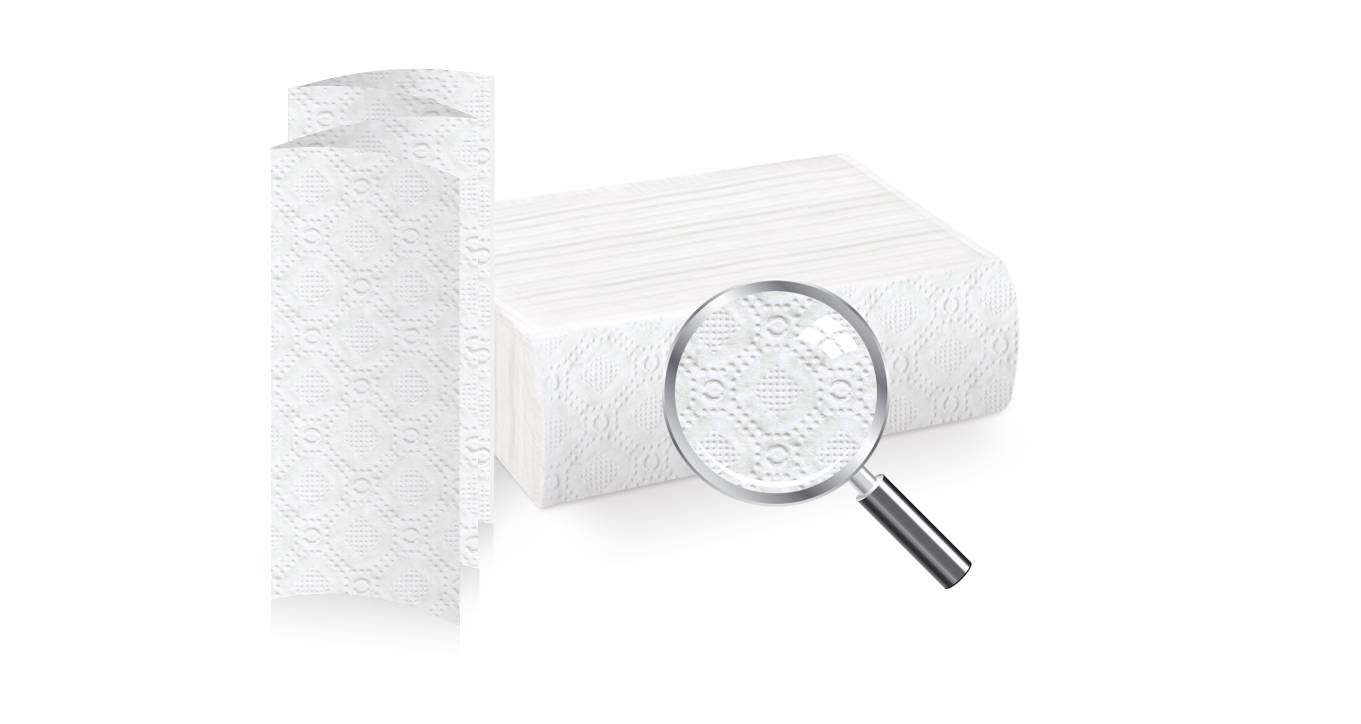 Цвет основы — белый. Количество слоев — 2. Плотность одного слоя — 19 г/м2. Без рисунка, с тиснением. Сырье — первичное, влагостойкое. Количество листов — 150 шт. Размер листа — 200х220 мм. Упаковка пачки — полиэтилен. Внешняя упаковка — гофрокороб. Поставляются упаковкой 18 пачек.