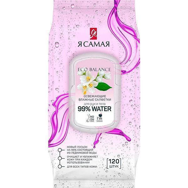 Освежающий лосьон салфеток Я самая на 99% состоит из воды высокой степени очистки. Эта вода не содержит примесей тяжелых солей металлов и микроорганизмов. Глицерин, входящий в состав лосьона, смягчает и увлажняет кожу. Салфетки подходят для бережного ухода за кожей рук и тела, мягко и эффективно убирают загрязнения, увлажняют кожу, дарят ощущение свежести.