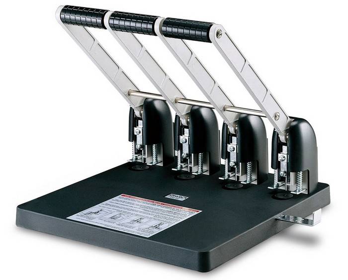 Сверхмощный офисный металлический дырокол мощностью пробивания до 150 листов бумаги, 4 отверстия. Основание изготовлено из ABS-пластика. Есть линейка деления на форматы. Диаметр отверстия - 7 мм.
