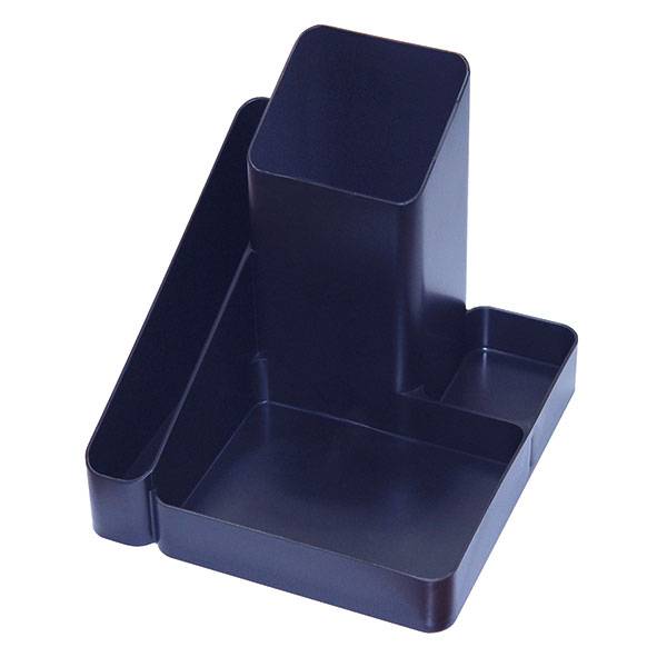 Подставка настольная для письменных и канцелярских принадлежностей с 4 отделениями различной высоты, изготовлена из пластика.