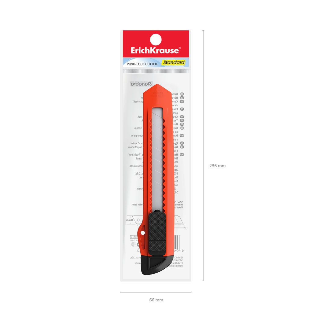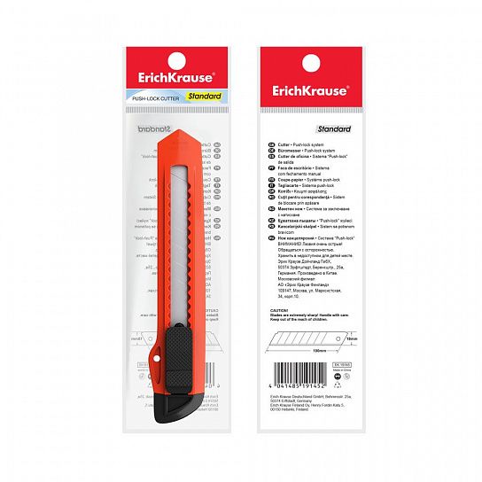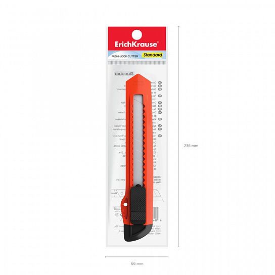 Нож канцелярский с механической системой фиксации лезвия push-lock и насадкой для безопасного отделения сегмента лезвия. Корпус ножа изготовлен из легкого и прочного пластика. Комплектуется износостойким стальным сегментированным лезвием с двухсторонней заточкой. Товар поставляется в нескольких вариантах цвета/дизайна без возможности выбора.