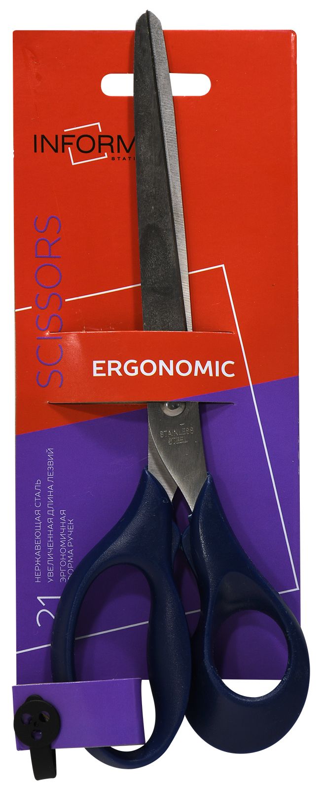 Ножницы из высококачественной нержавеющей стали. Лезвия с особо острой заточкой. Ручки пластиковые эргономичные — гарантируют максимально комфортную работу с ножницами. Упаковка — блистер с европодвесом.