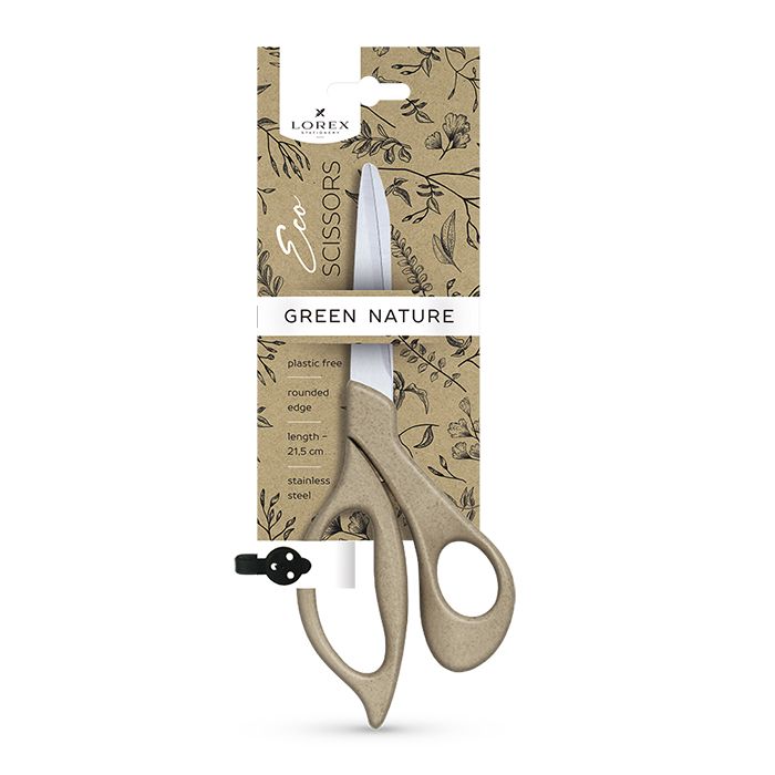 Ножницы LOREX ECO серии GREEN NATURE — это ножницы, вдохновлённые природой. Ручки выполнены из переработанного эко-материала. Форма ручек — эргономичная, поэтому резать ими комфортно, рука долгое время не устанет. Лезвия изготовлены из нержавеющей стали. Длина 21,5 см.