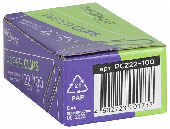 Скрепки канцелярские оцинкованные. Имеют светло-серебристую поверхность, не оставляют следов. Изготовлены из высококачественной стали. Упакованы в картонную коробку. В упаковке - 100 шт. Длина скрепки - 22 мм. Стандартной овальной формы.
