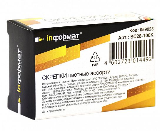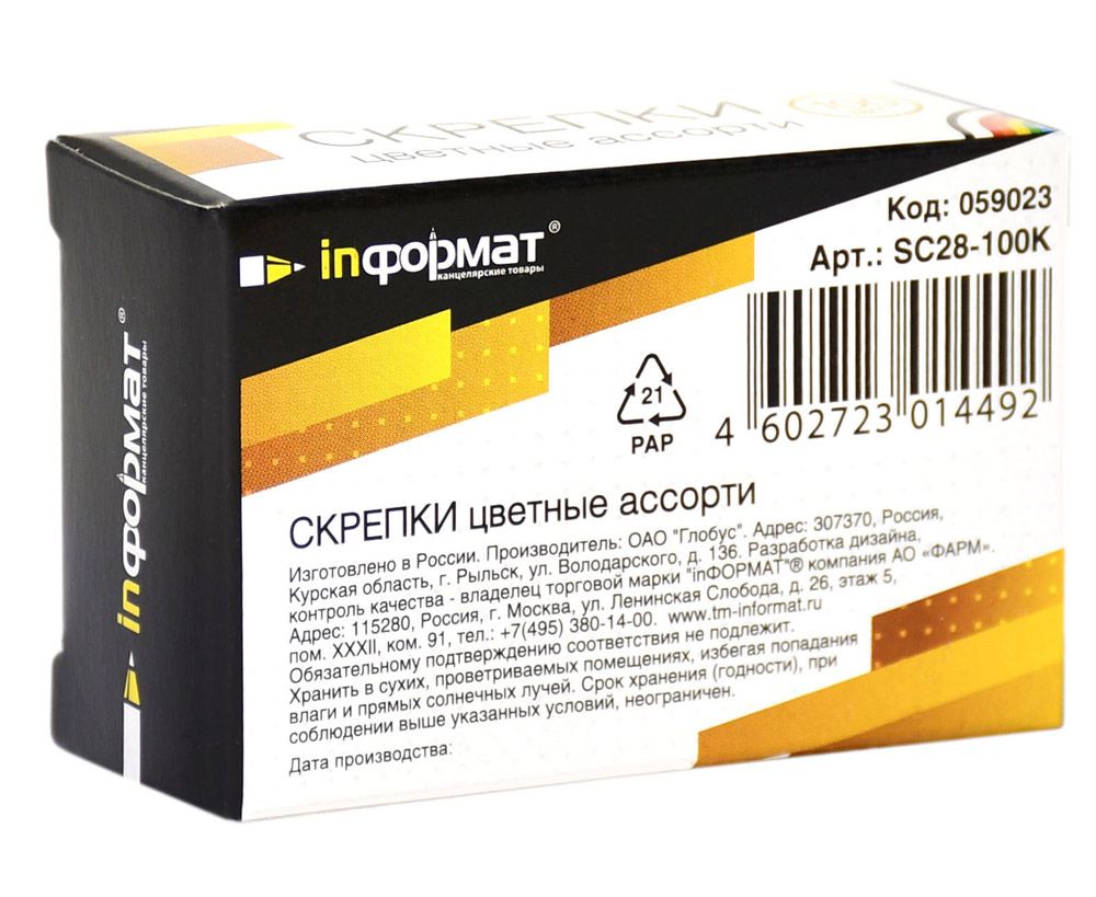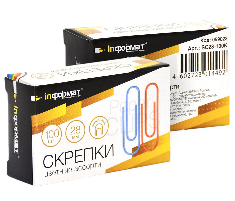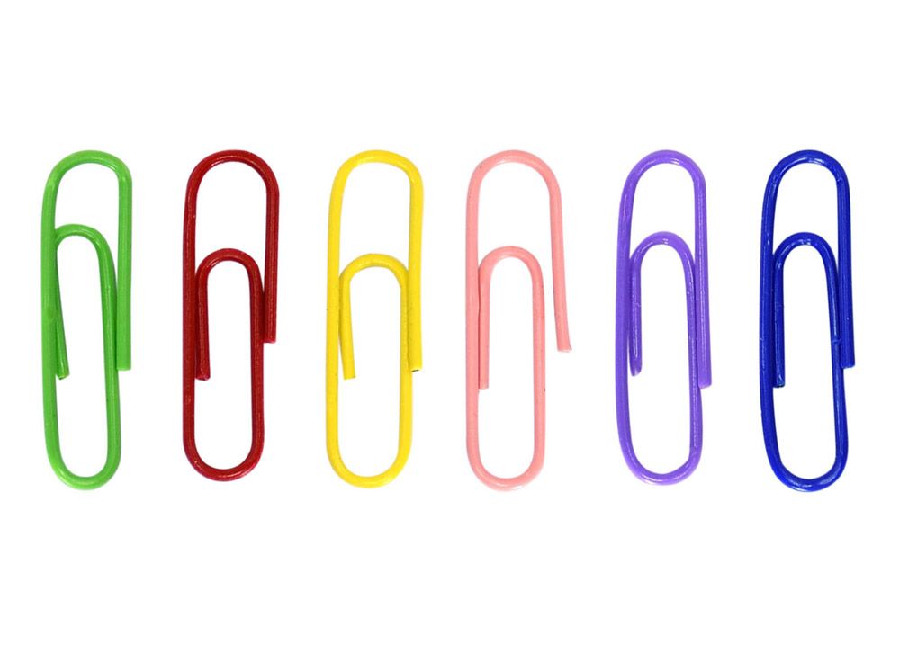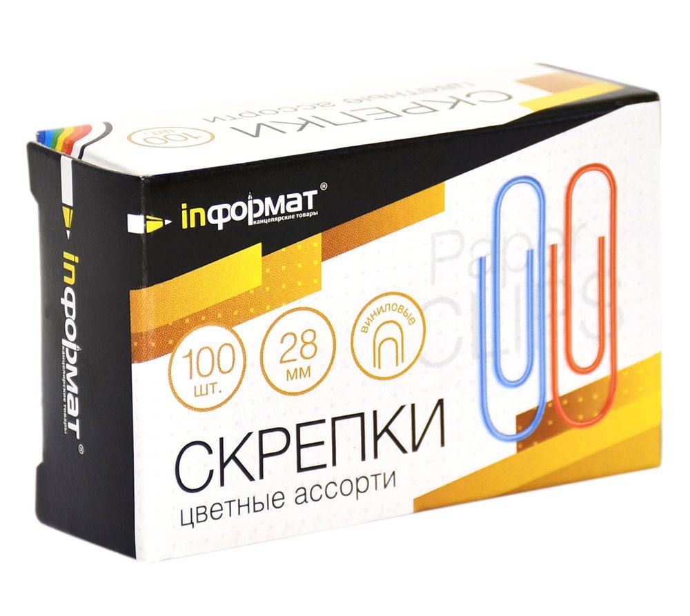 Скрепки металлические с цветным покрытием. Упакованы в картонную коробку. В упаковке 100 шт. Длинна скрепки - 28 мм. Стандартной овальной формы.