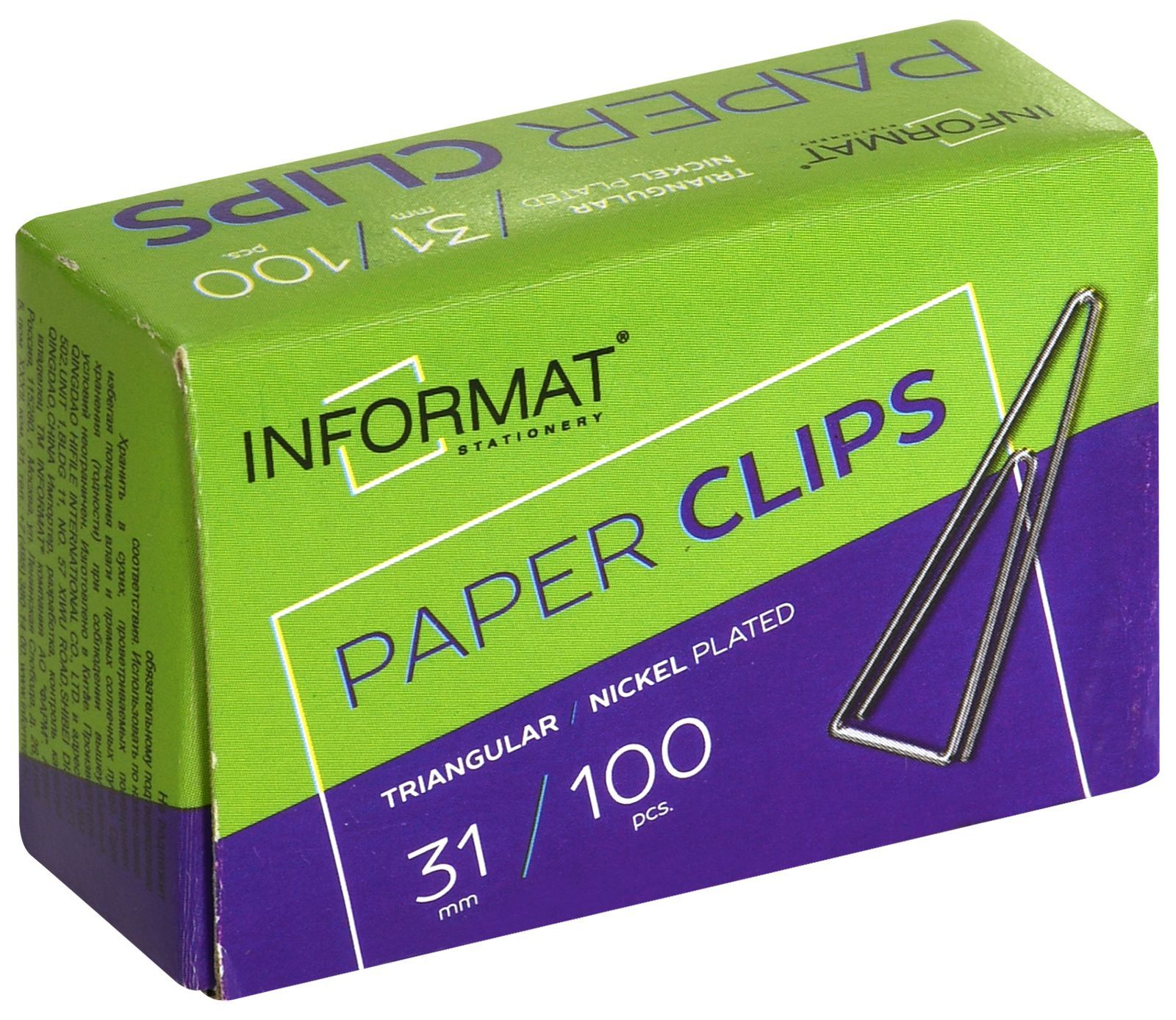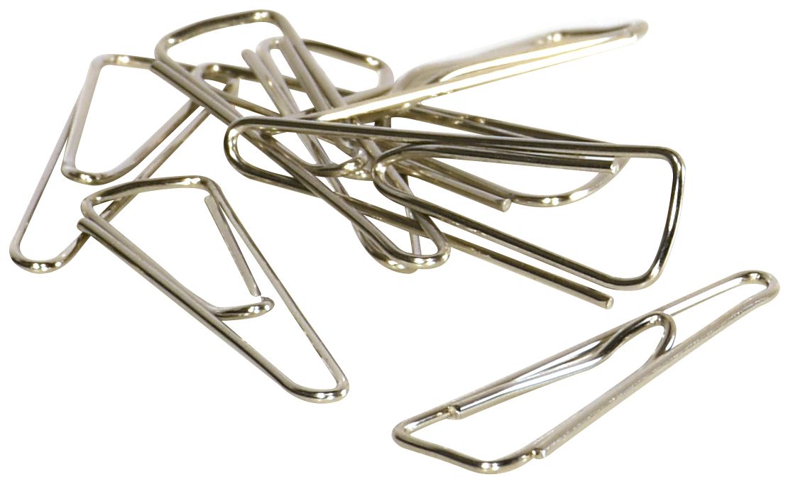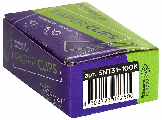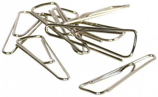 Скрепки никелированные фигурные (треугольные, загнутые). Изготовлены из высококачественной стали. Упакованы в картонную коробку. В упаковке 100 шт. Длина скрепки - 31 мм.