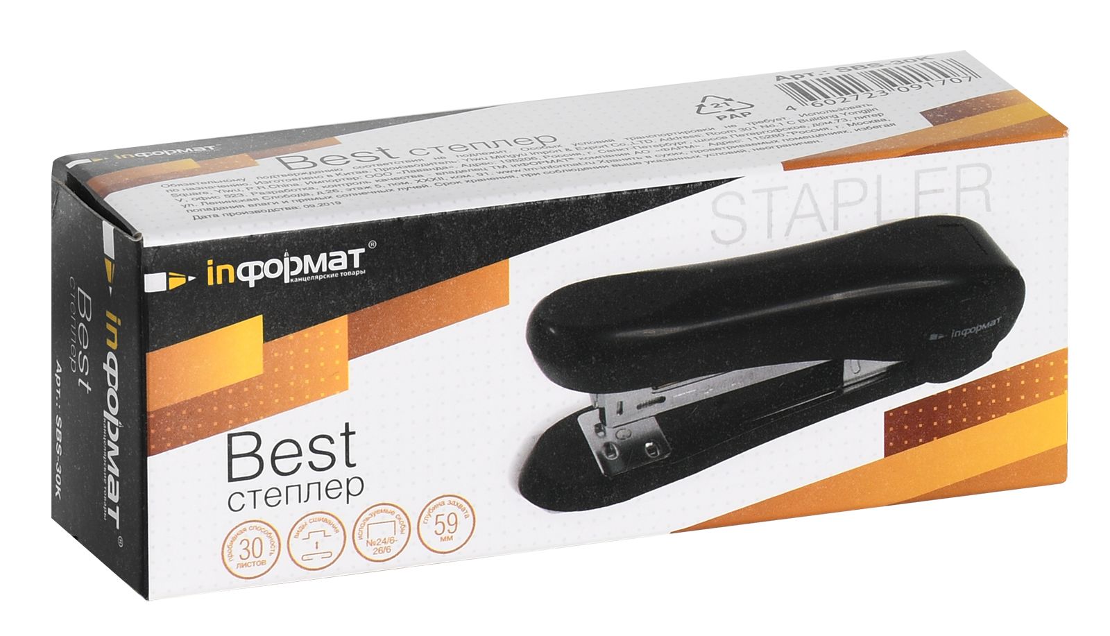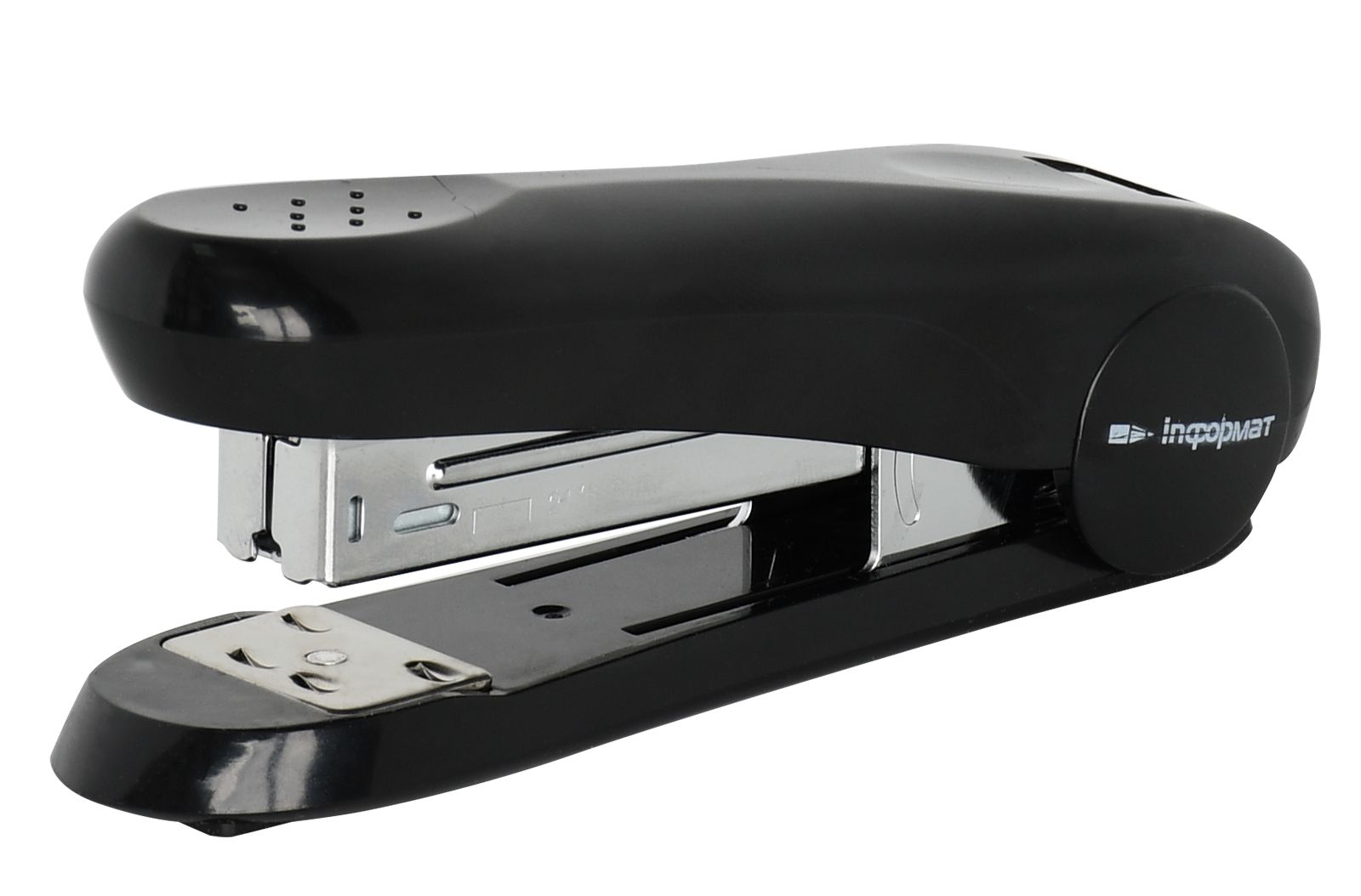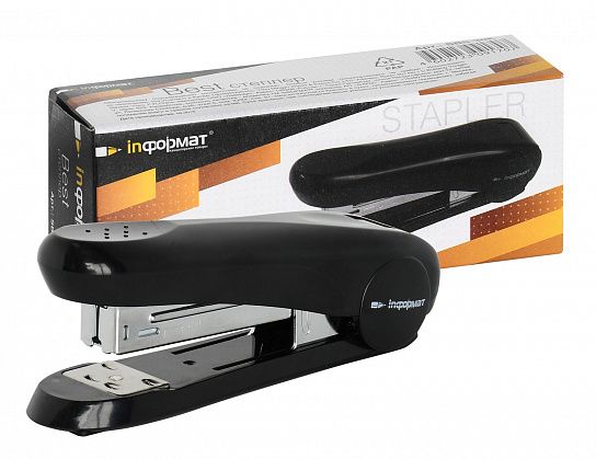 Степлеры INFORMAT серии Best — прочные и надёжные, но в то же время лёгкие и удобные. Эргономичный корпус изготовлен из высококачественного пластика, механизм сверхпрочный цельнометаллический. Цвет корпуса подобран в классических офисных тонах. Пробивная способность до 30 листов. Без встроенного антистеплера. Окно контроля за количеством оставшихся скоб, скобы — №24/6 и 26/6. Имеют два вида сшивания – открытый и закрытый. Глубина захвата бумаги – 59 мм, без возможности регулирования глубины закладки бумаги. Габариты: высота — 46 мм, ширина — 34 мм, длина — 127 мм.