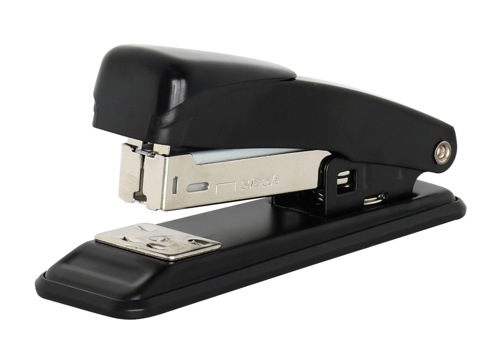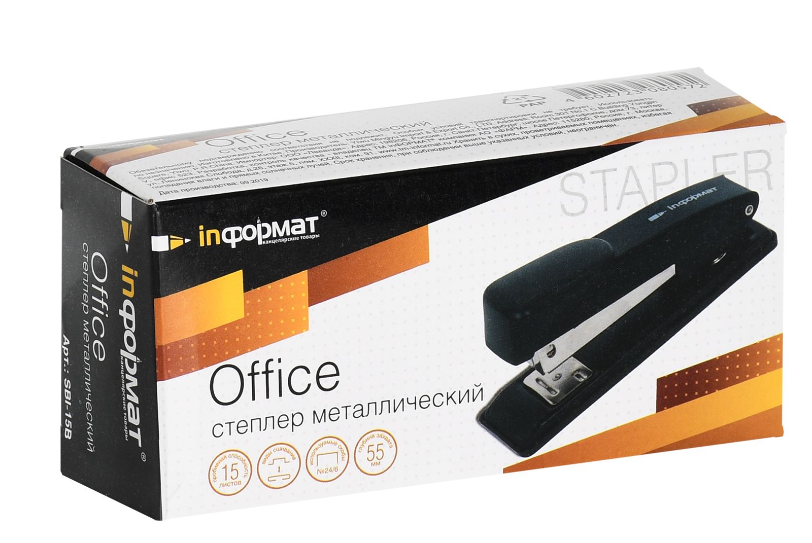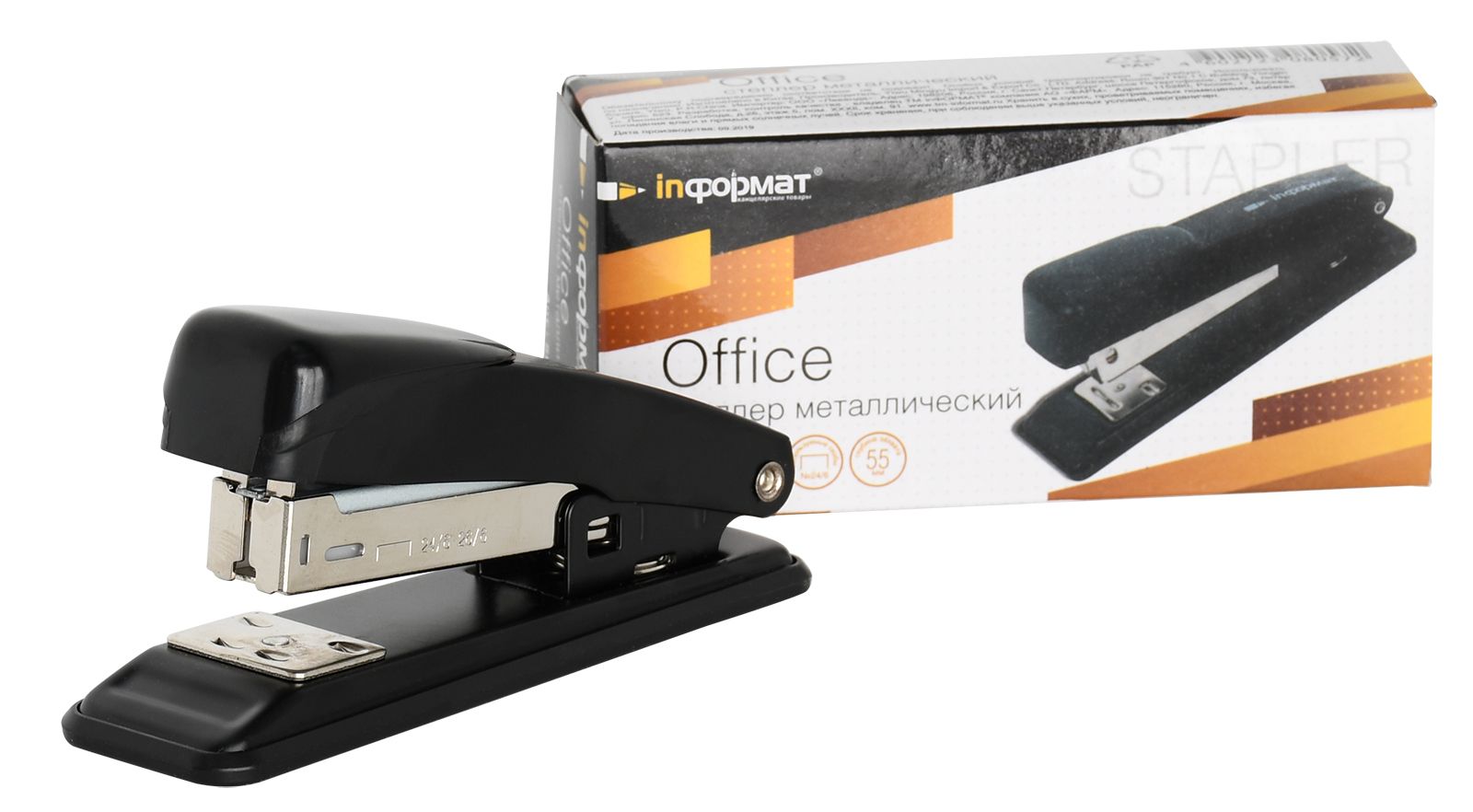 Степлер INFORMAT Office №24/6 имеет металлический механизм и металлический корпус с пластиковой вставкой черного цвета. Пробивает до 15 листов. Подходят скобы – 24/6. С верхней загрузкой скоб, без встроенного антистеплера. Имеет два режима сшивания – открытый и закрытый. Глубина закладки бумаги – 55 мм, без возможности регулировки глубины закладки бумаги. Габариты: высота — 51 мм, ширина — 34 мм, длина — 115 мм.