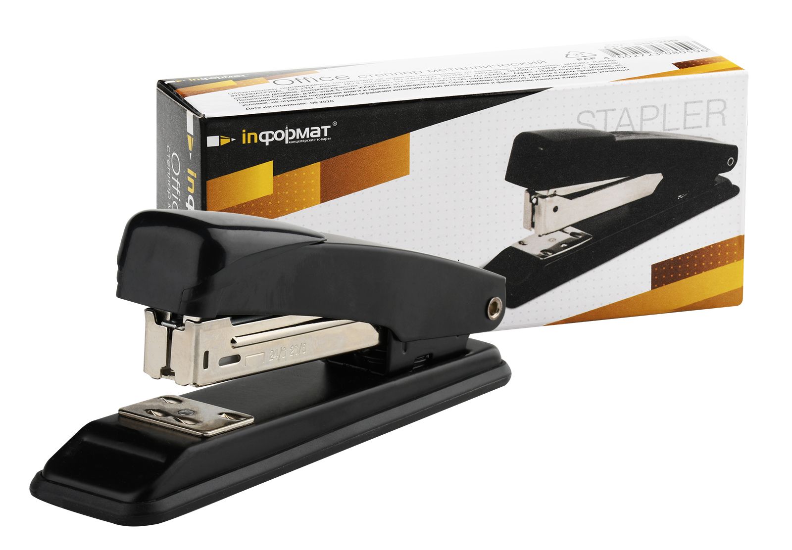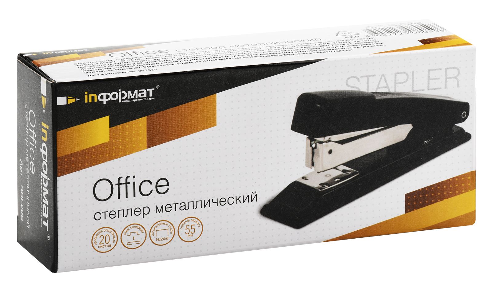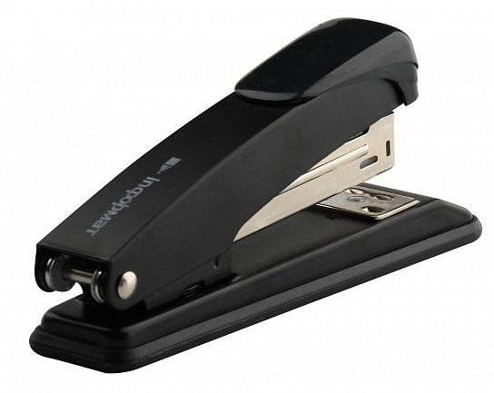 Степлер INFORMAT Office №24/6 имеет металлический механизм и металлический корпус с пластиковой вставкой черного цвета. Пробивает до 20 листов. Подходят скобы – 24/6. С верхней загрузкой скоб, без встроенного антистеплера. Имеет два режима сшивания – открытый и закрытый. Глубина закладки бумаги – 55 мм, без возможности регулировки глубины закладки бумаги. Габариты: высота — 57 мм, ширина — 35 мм, длина — 135 мм.