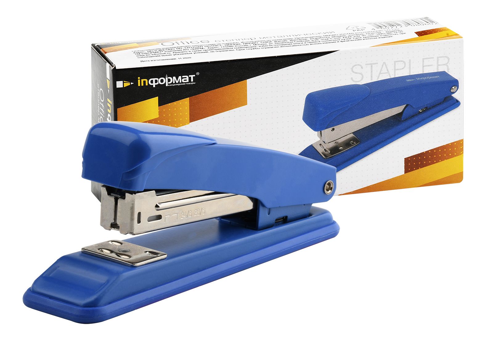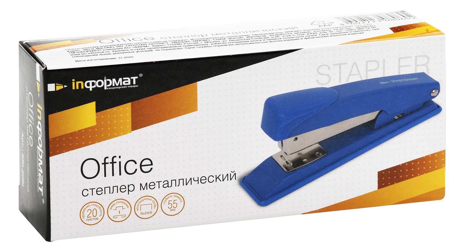 Степлер INFORMAT Office №24/6 имеет металлический механизм и металлический корпус с пластиковой вставкой синего цвета. Пробивает до 20 листов. Подходят скобы – 24/6. С верхней загрузкой скоб, без встроенного антистеплера. Имеет два режима сшивания – открытый и закрытый. Глубина закладки бумаги – 55 мм, без возможности регулировки глубины закладки бумаги. Габариты: высота — 57 мм, ширина — 35 мм, длина — 135 мм.