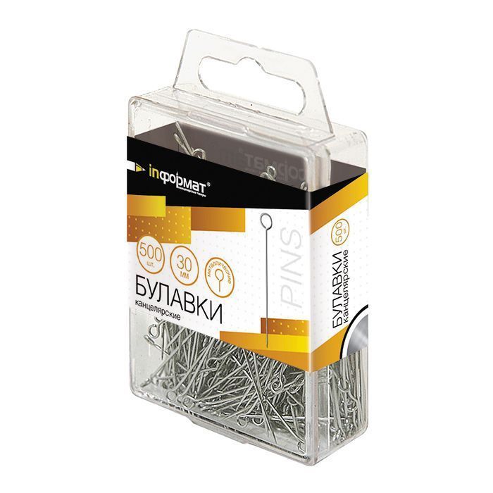 Канцелярские булавки INFORMAT выпускаются в прозрачных боксах с европодвесом в наборах по 500 штук. Размер — 30 мм, изготовлены из металла. Булавки тонкие и острые, легко втыкаются в пенопласт, пробку, дерево, и даже в стену из ДСП.