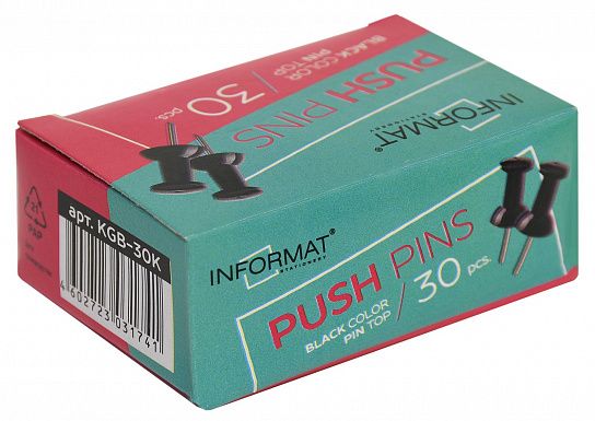 Кнопки канцелярские применяются для крепления листов с информацией к офисным пробковым доскам и другим поверхностям. Кнопки отличаются повышенной прочностью. Упакованы по 30 штук.