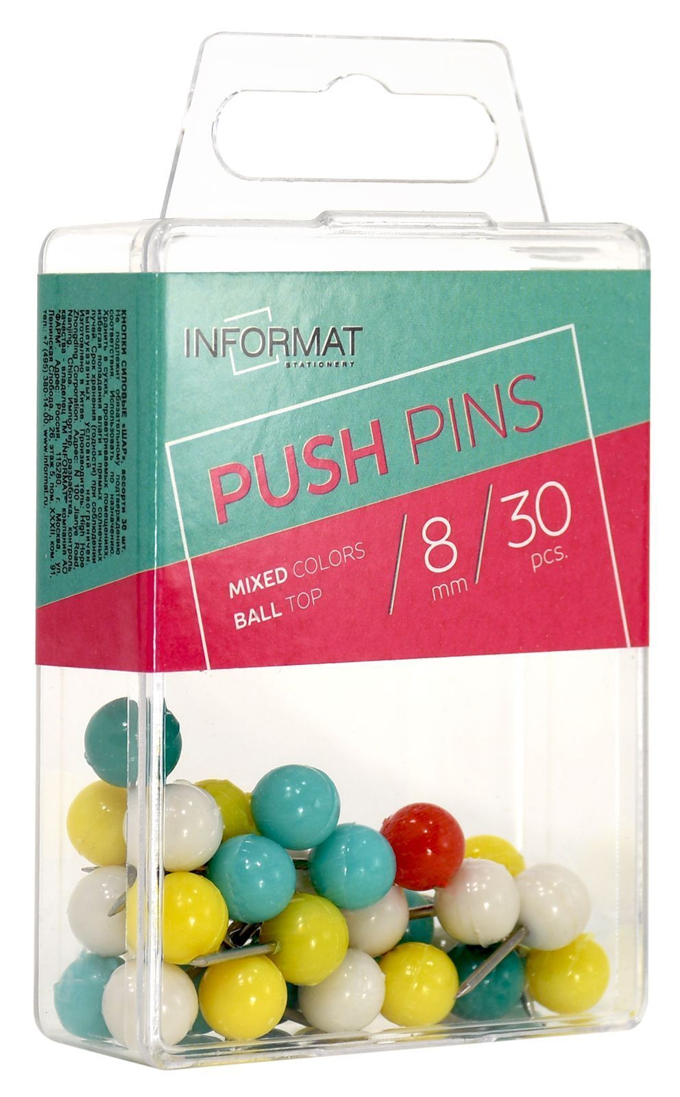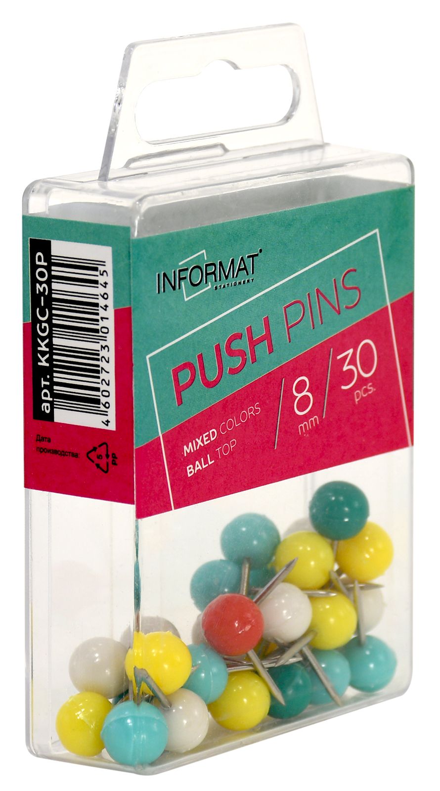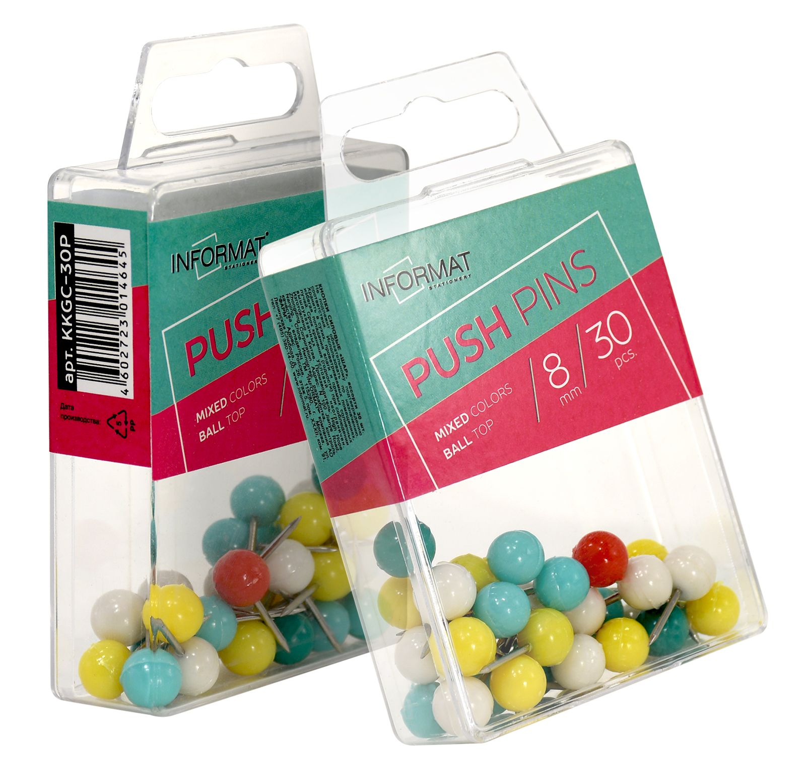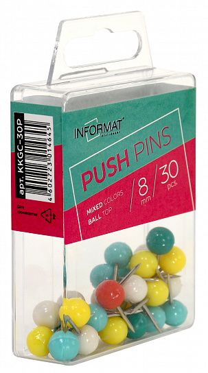 Кнопки канцелярские применяются для крепления листов с информацией к офисным пробковым доскам и другим поверхностям. Кнопки отличаются повышенной прочностью. Упакованы по 30 штук.
