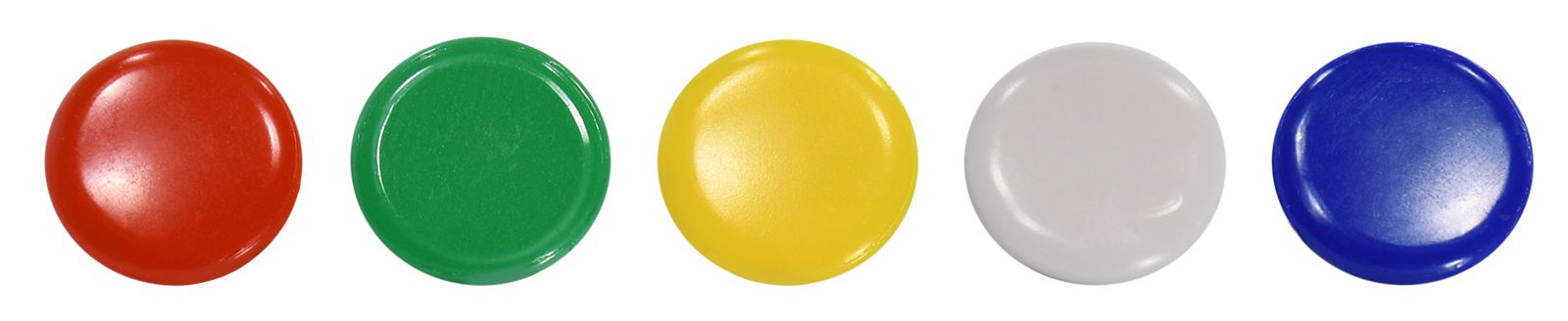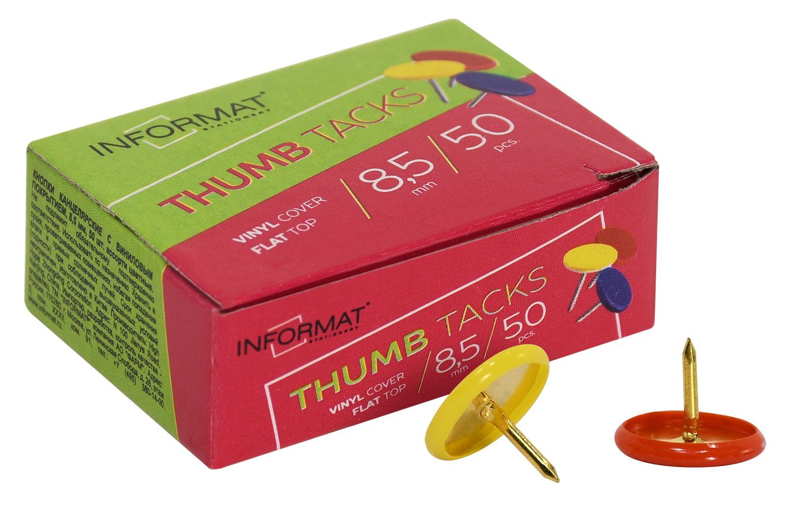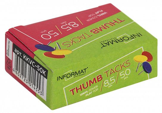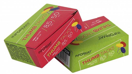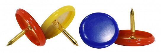 Кнопки изготовлены из металла с цветным и медным покрытием. Кнопки представлены в двух видах упаковки. Кнопки предназначены для крепления листов с информацией к офисным пробковым доскам и другим поверхностям.