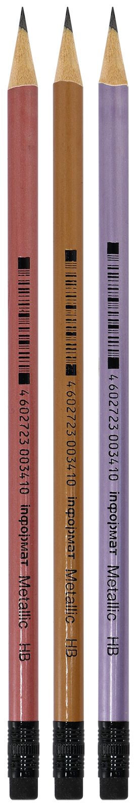 Карандаш чернографитный круглый заточенный с ластиком черного цвета. Корпус цвета металлик. Цвета корпуса: серебряный, золотой, розовый. Помимо стандартной упаковки предлагаются карандаши в удобной пластиковой тубе с цветной этикеткой. В каждой тубе размещено по 48 карандашей.