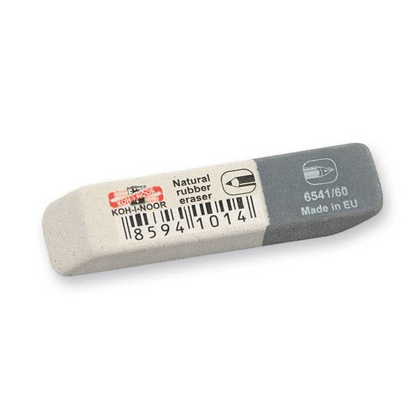 Комбинированный ластик из натурального каучука. Белая сторона — для графитовых и цветных карандашей, серая сторона — для чернил и художественного угля. При стирании не повреждает бумагу, не оставляет грязных следов.