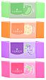 Микс ярких цветов, с этими ластиками любой творческий процесс станет приятнее. Удобная классическая форма ластиков позволяет стирать мелкие детали, не оставляя следов на бумаге.Ассорти 4 дизайнов представлено в стильном красочном дисплее по 24 шт.