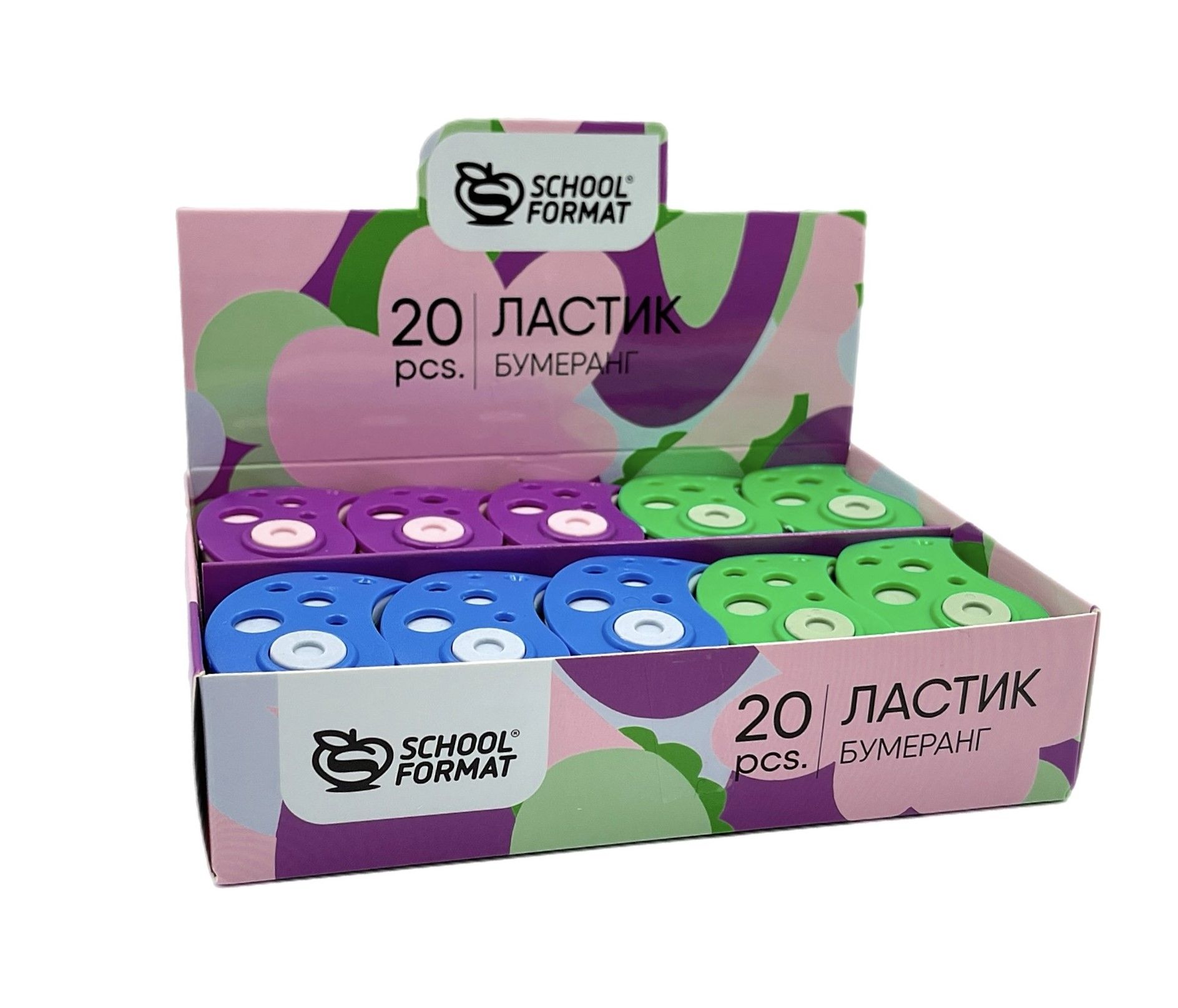 Яркий ластик в виде бумеранга - это что-то новое. Необычная форма позволит без труда стереть любые штрихи, а оригинальный дизайн - хранить ластик в любимом пенале. Ассорти из 3 стильных оттенков упаковано в красочном дисплее по 20 шт.