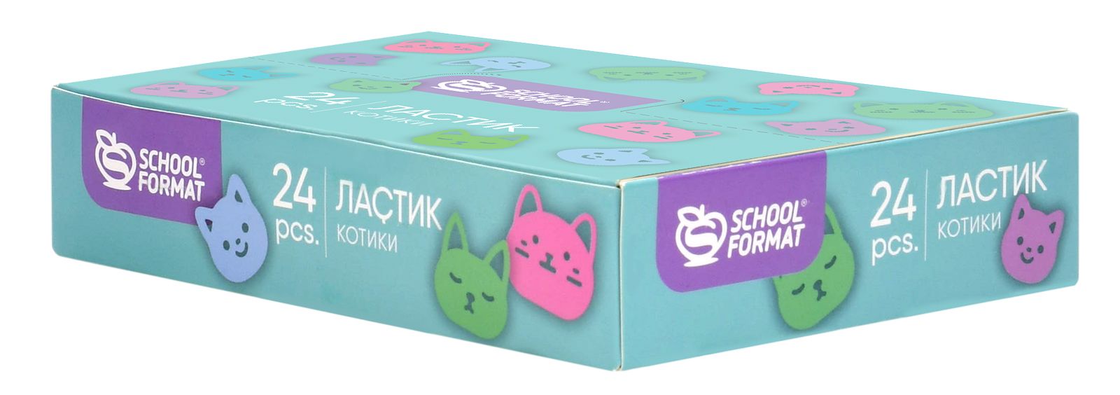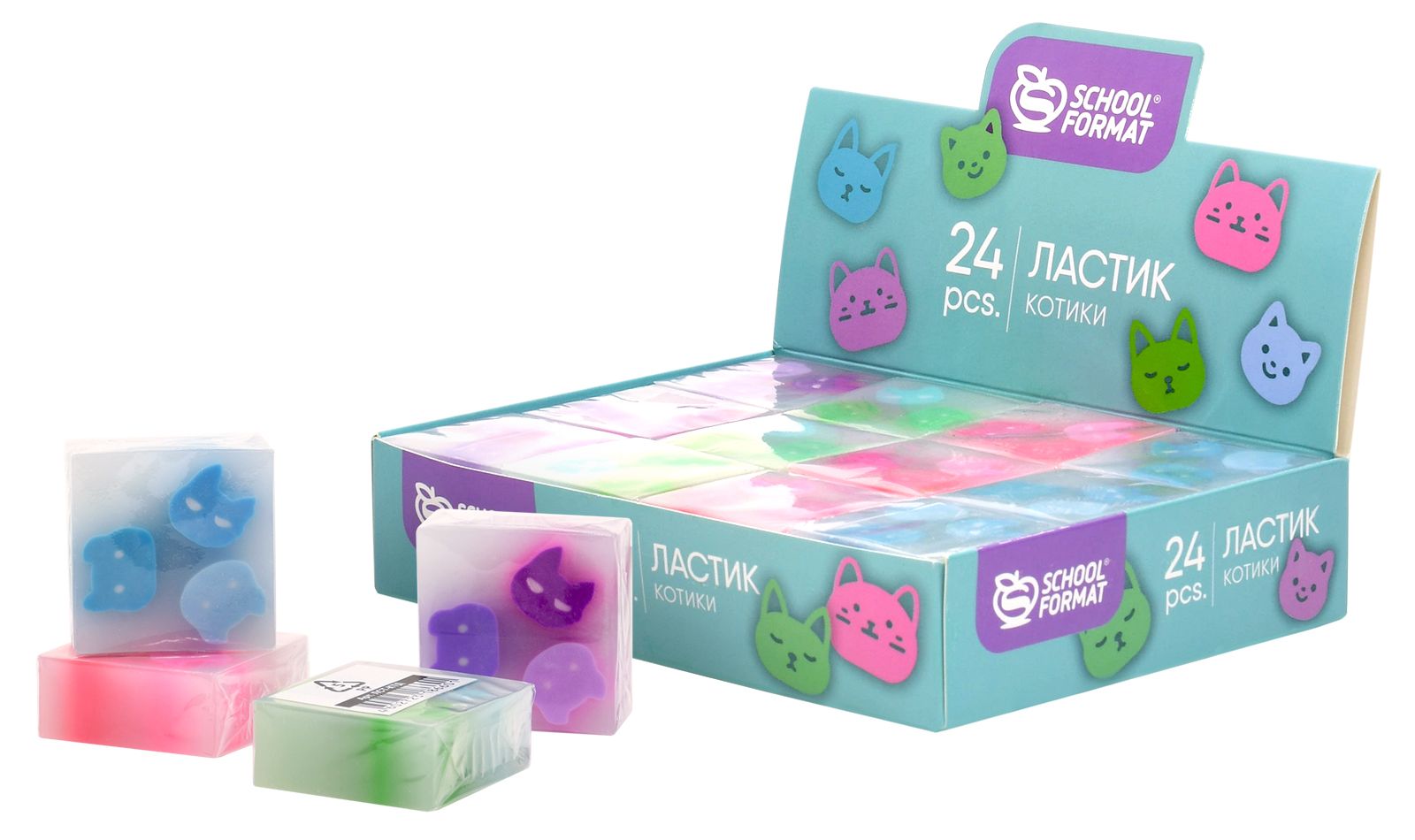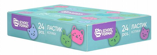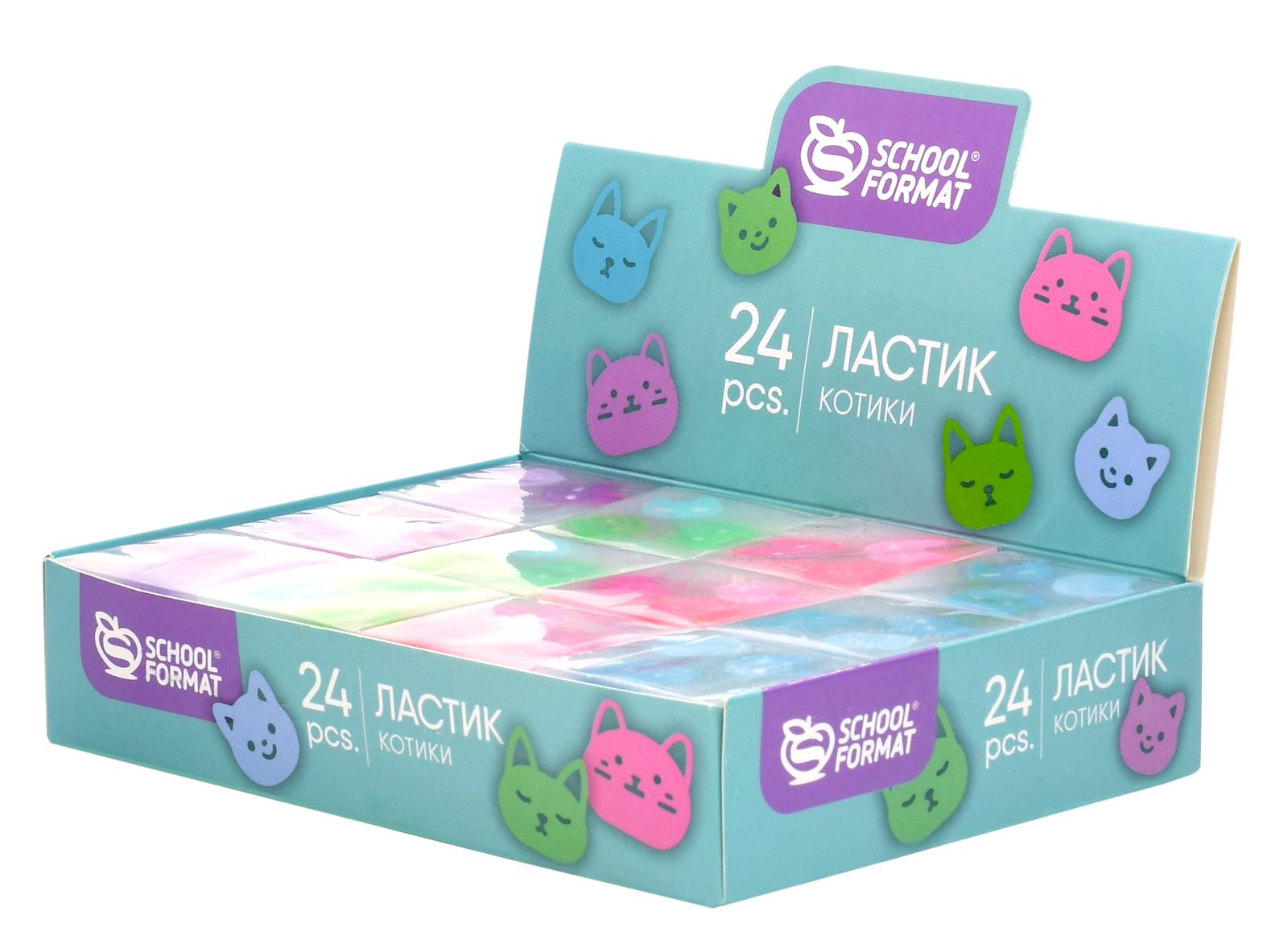 Удобная квадратная форма позволит стирать мелкие детали. Микс из 4 цветов, каждый ластик украшен милейшими мордашками котиков трендовых пастельных оттенков. Красочные и необычные, эти ластики могут похвастаться не только своим оригинальным дизайном, но и практичной компактной формой.Ассорти из 4 дизайнов представлено в ярком картонном дисплее по 24 шт.