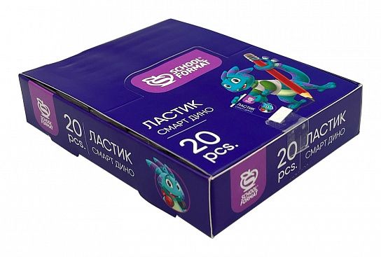 Классическая прямоугольная форма позволит без труда стирать и корректировать чертежи, рисунки и надписи. Контрастная упаковка с иллюстрацией веселого Дино стильно смотрится на чистом белом ластике.Все ластики укомплектованы в яркий картонный дисплей по 20 шт.
