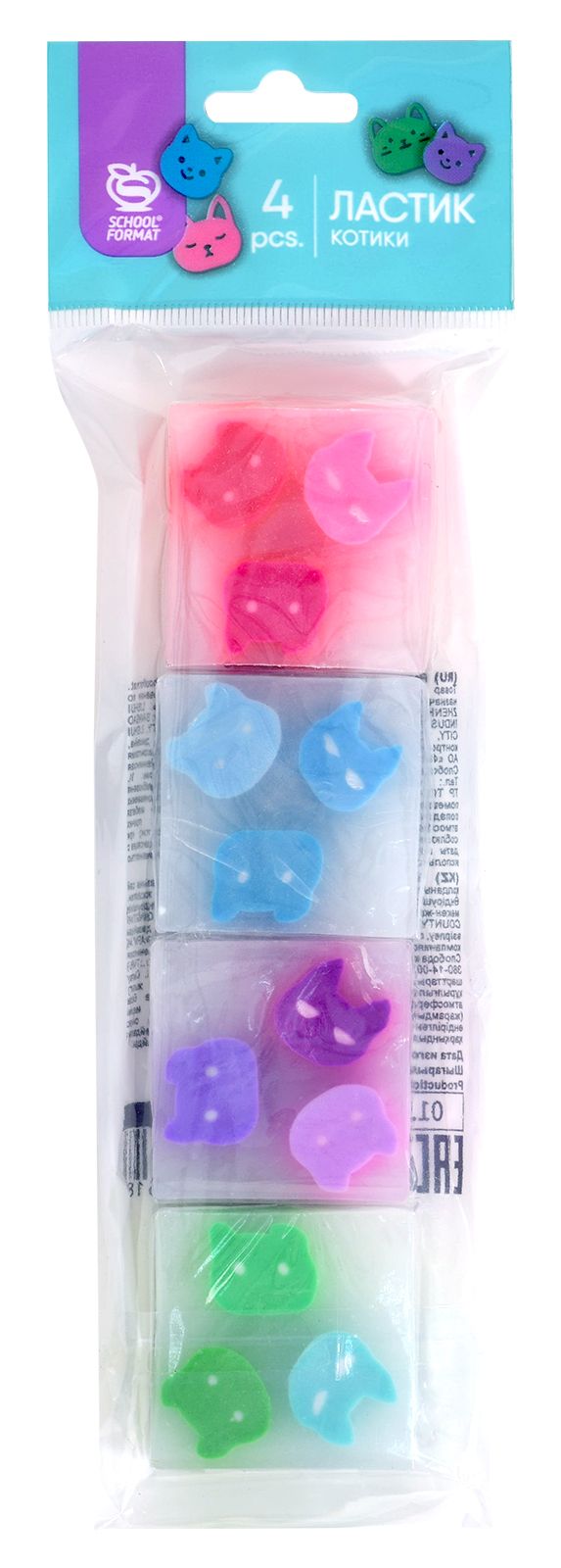 Удобная квадратная форма позволит стирать мелкие детали. Микс из 4 цветов, каждый ластик украшен милейшими мордашками котиков трендовых пастельных оттенков. Красочные и необычные, эти ластики могут похвастаться не только своим оригинальным дизайном, но и практичной компактной формой.Ассорти из 4 дизайнов представлено в стильном прозрачном пакете с европодвесом.