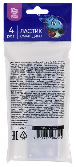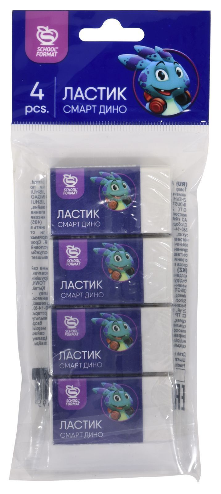 Классическая прямоугольная форма позволит без труда стирать и корректировать чертежи, рисунки и надписи. Контрастная упаковка с иллюстрацией веселого Дино стильно смотрится на чистом белом ластике.Все ластики укомплектованы в прозрачном пакете по 4 шт.