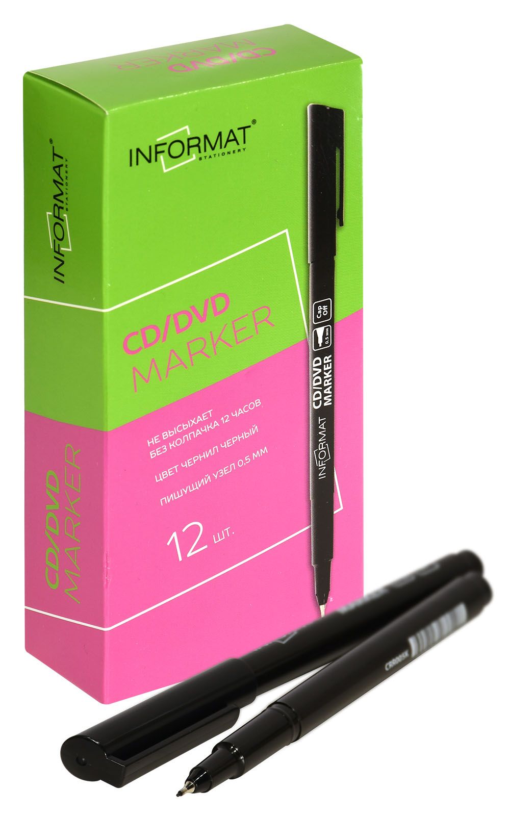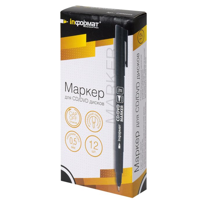 CD/DVD маркер предназначен для письма на CD и DVD дисках. Маркеры не наносят вреда информации на носителях. Перманентные водостойкие чернила на спиртовой основе моментально сохнут и не смазываются с информационного носителя. Удобный округлый корпус, тонкий закругленный наконечник. Система Cap-Off — маркер не высыхает без колпачка в течение 12 часов. Диаметр пишущего узла 0,5 мм.