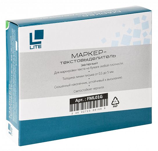 Маркер для выделения текста на всех видах бумаги, в том числе на бумаге для факса и пишущих машин. Корпус гладкий, матовый, пишущий наконечник устойчив к деформации, мягко скользит по бумаге, имеет клиновидную форму. Маркер позволяет провести линию толщиной от 0,5 до 5 мм.