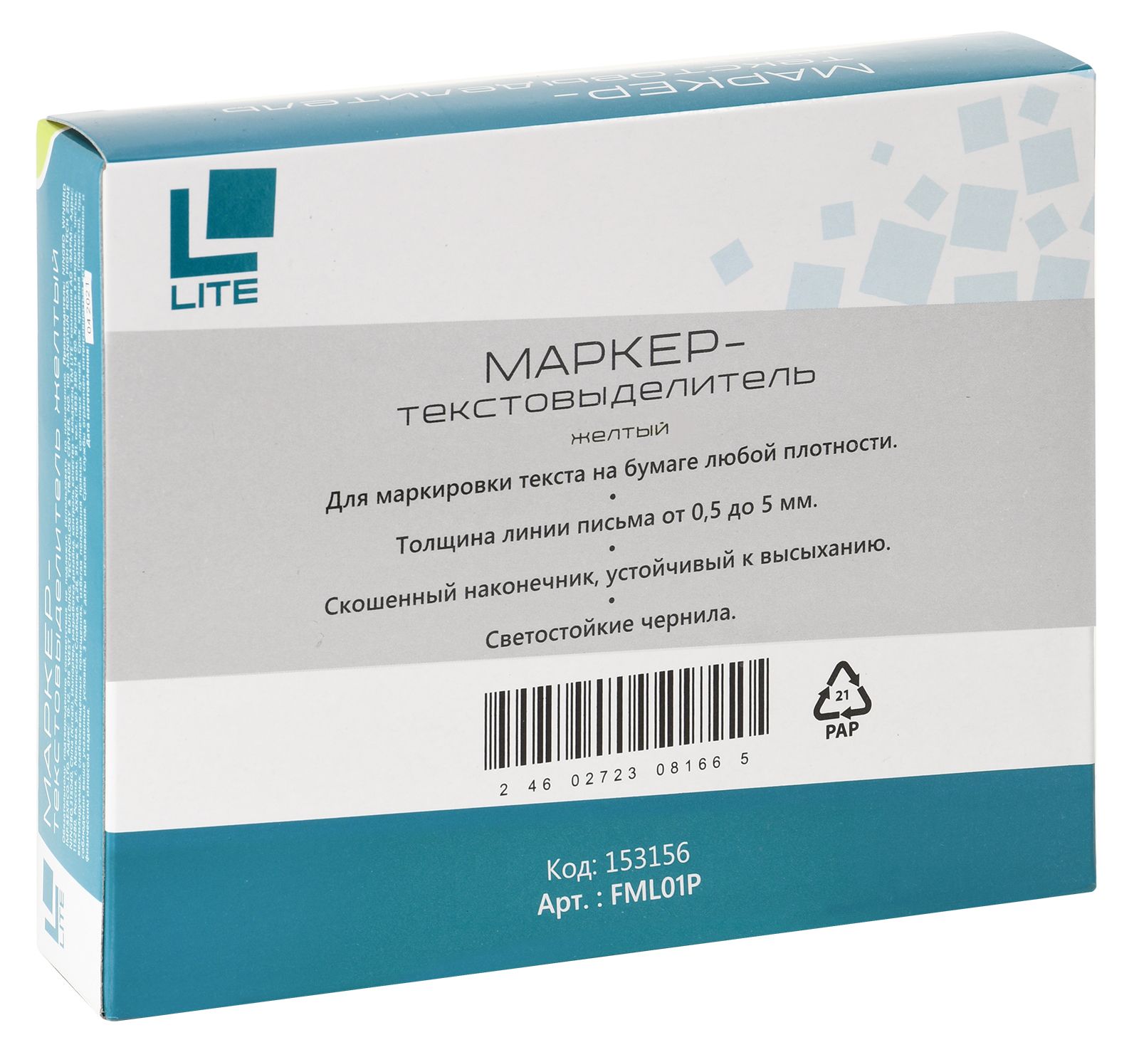 Маркер для выделения текста на всех видах бумаги, в том числе на бумаге для факса и пишущих машин. Корпус гладкий, матовый, пишущий наконечник устойчив к деформации, мягко скользит по бумаге, имеет клиновидную форму. Маркер позволяет провести линию толщиной от 0,5 до 5 мм.