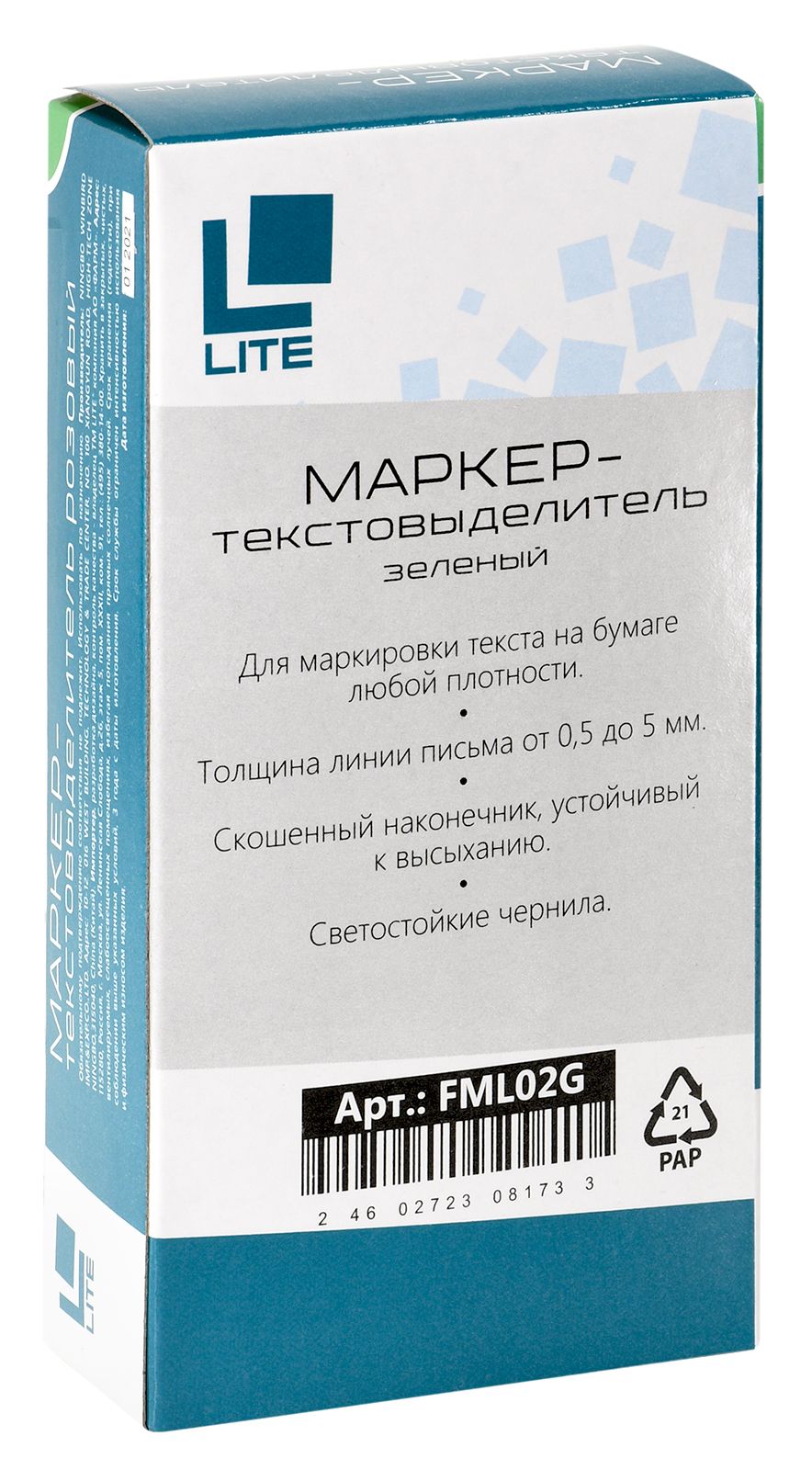 Маркер для выделения текста на всех видах бумаги, в том числе на бумаге для факса и пишущих машин. Корпус круглый, пишущий наконечник устойчив к деформации, мягко скользит по бумаге, имеет клиновидную форму. Маркер позволяет провести линию толщиной от 0,5 до 5 мм.