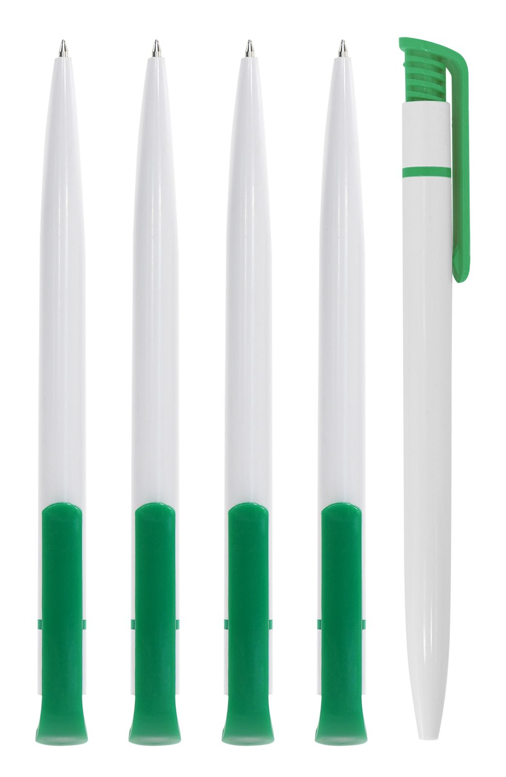 Цвет чернил: синий Механизм автоматической ручки: кнопочный Цвет корпуса: бело-зеленый корпус Толщина линии письма, мм: 0,35 Наличие резинового грипа: Нет Упаковка: картонная коробка Мин. партия и варианты упаковок: 1 / 50 / 1000 -