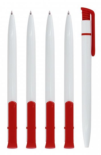 Автоматическая шариковая ручка для логотипа. Бело-красный корпус. Имеет удобный кнопочный механизм подачи пишущего узла. Не царапает бумагу при письме. Обеспечивает легкое и мягкое письмо, яркие и насыщенные линии. Чернила быстро высыхают и не размазываются. Пишущий узел — 0,7 мм. Цвет чернил — синий. Длина стержня — 114 мм, с упором.