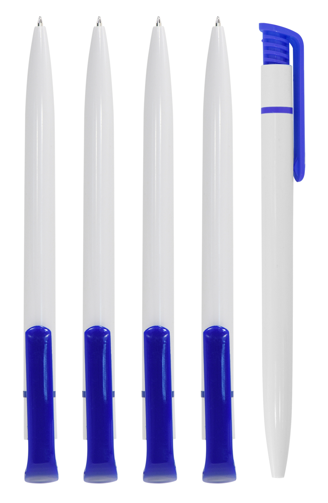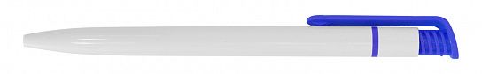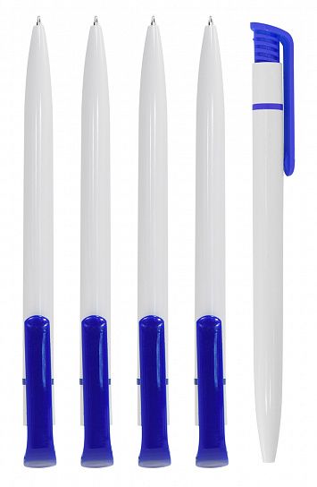 Автоматическая шариковая ручка для логотипа. Бело-синий корпус. Имеет удобный кнопочный механизм подачи пишущего узла. Не царапает бумагу при письме. Обеспечивает легкое и мягкое письмо, яркие и насыщенные линии. Чернила быстро высыхают и не размазываются. Пишущий узел — 0,7 мм. Цвет чернил — синий. Длина стержня — 114 мм, с упором.
