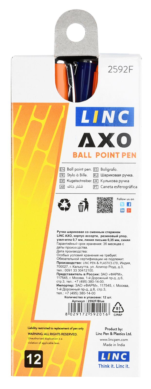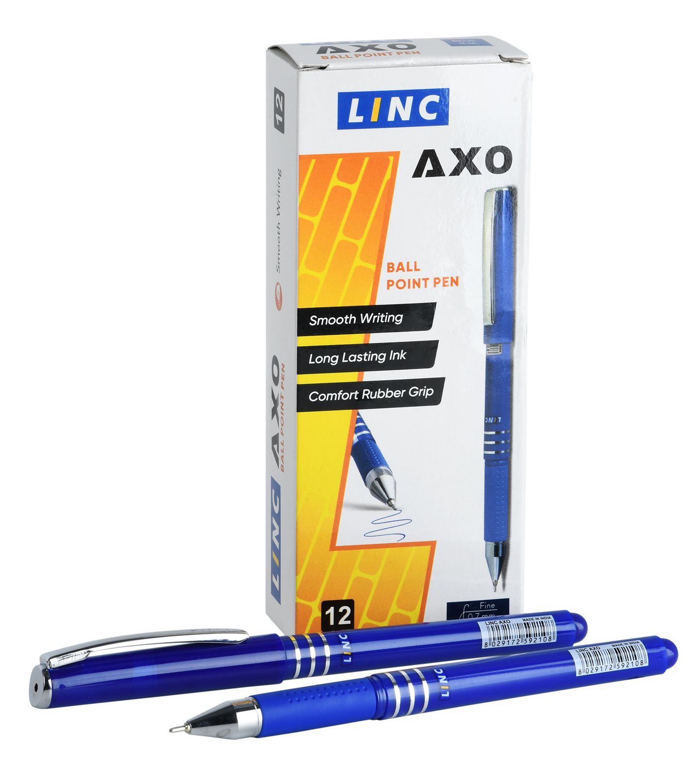 Шариковая ручка AXO — ручка ультрамягкого комфортного письма от известного бренда LINC. Разработана специально для долгого письма с внушительным запасом чернил (линия письма в 2 км) и удобным широким корпусом с мягкой резиновой манжетой. Пишет легко, мягко и плавно, без напряжения руки, оставляя ровный и четкий оттиск.