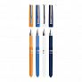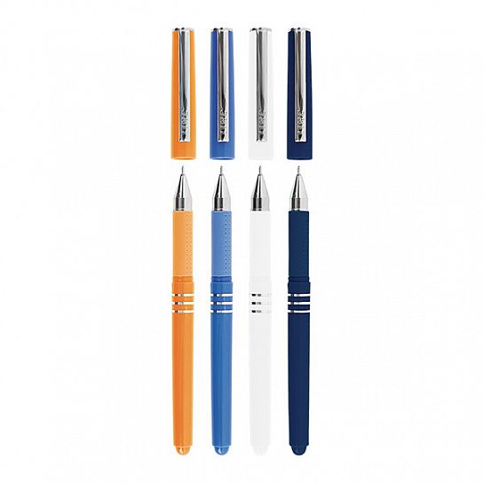 Имеет благородный, лаконичный и элегантный дизайн, с принтом в виде 3 серебряных колец, опоясывающих корпус, с металлическим клипом и наконечником. Выполнена из плотного пластика. Ручка выполнена в четырех цветовых версиях корпуса — белый, голубой, оранжевый, темно-синий.Пишущий узел - игла 0,7мм. Длина стержня 11,2 см. Цвет чернил - синий.