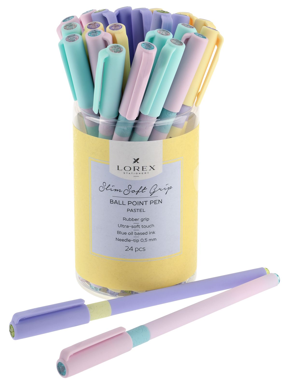 Ручки серии Slim Soft Grip — это тонкий элегантный корпус изготовленный по технологии Ultra-soft touch с резиновой манжеткой в зоне захвата. Чернила на масляной основе. Четыре пастельных цвета корпуса. Игловидный пишущий узел диаметром 0,5 мм. Длина стержня — 140 мм.