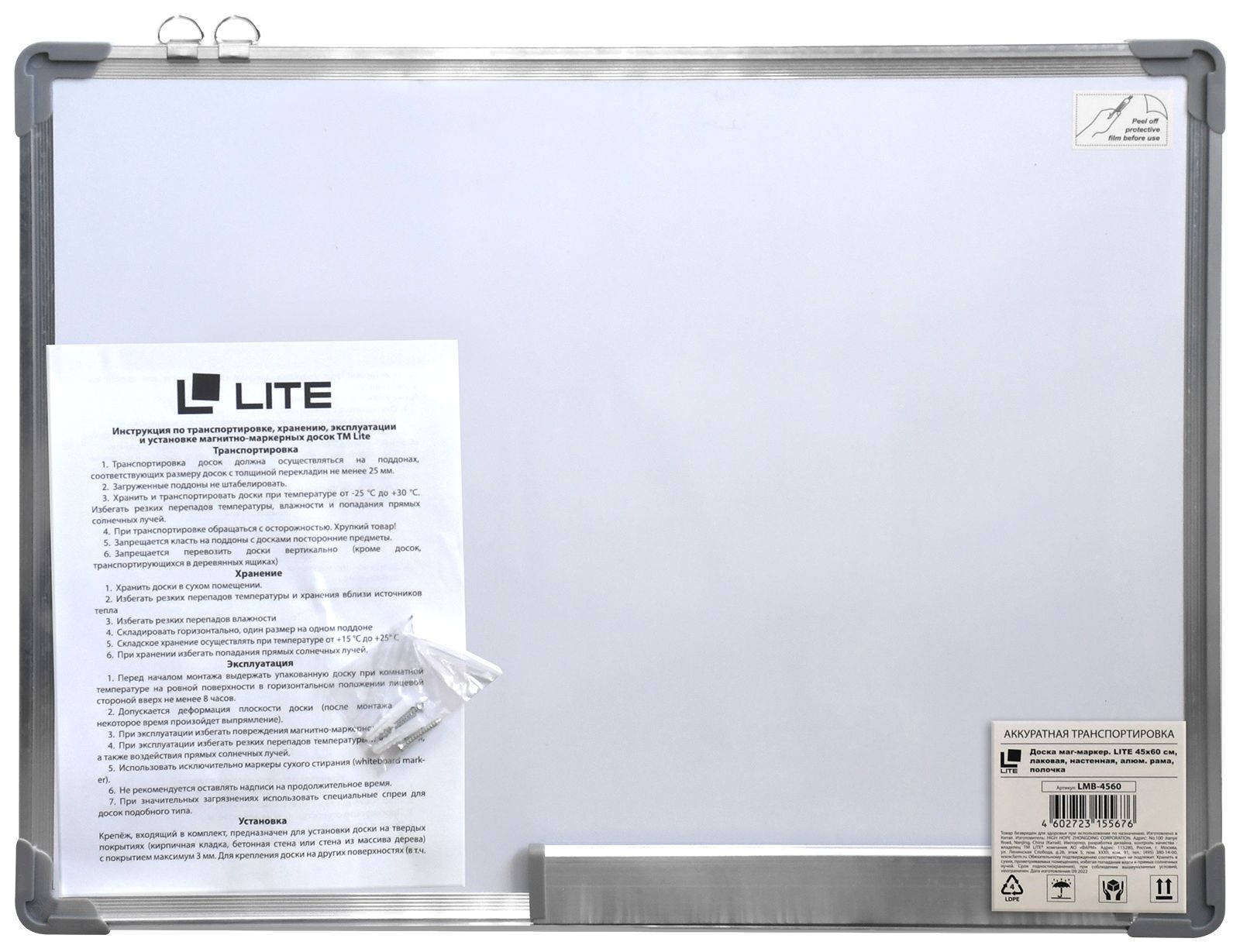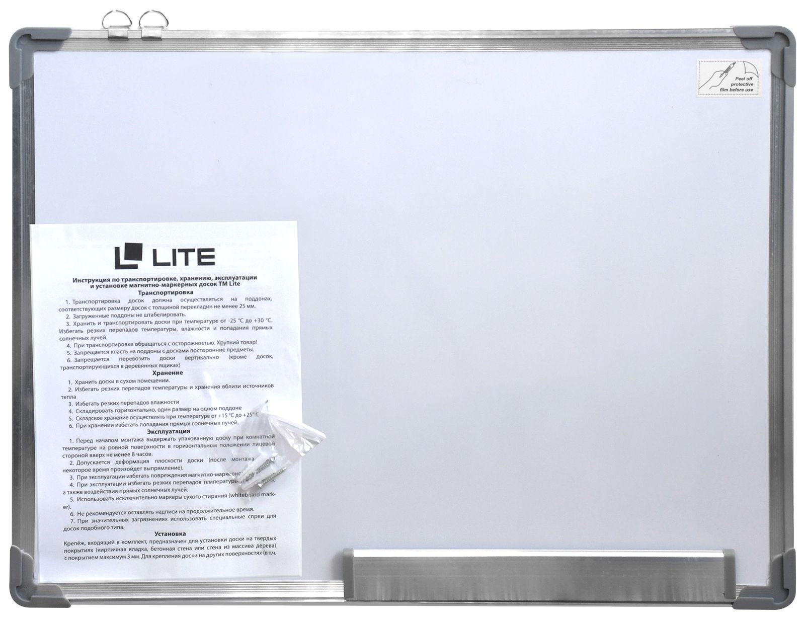 При стирании записей нужно использовать только специальные губки-стиратели. Полочка для маркеров и фурнитура для крепления в комплекте.