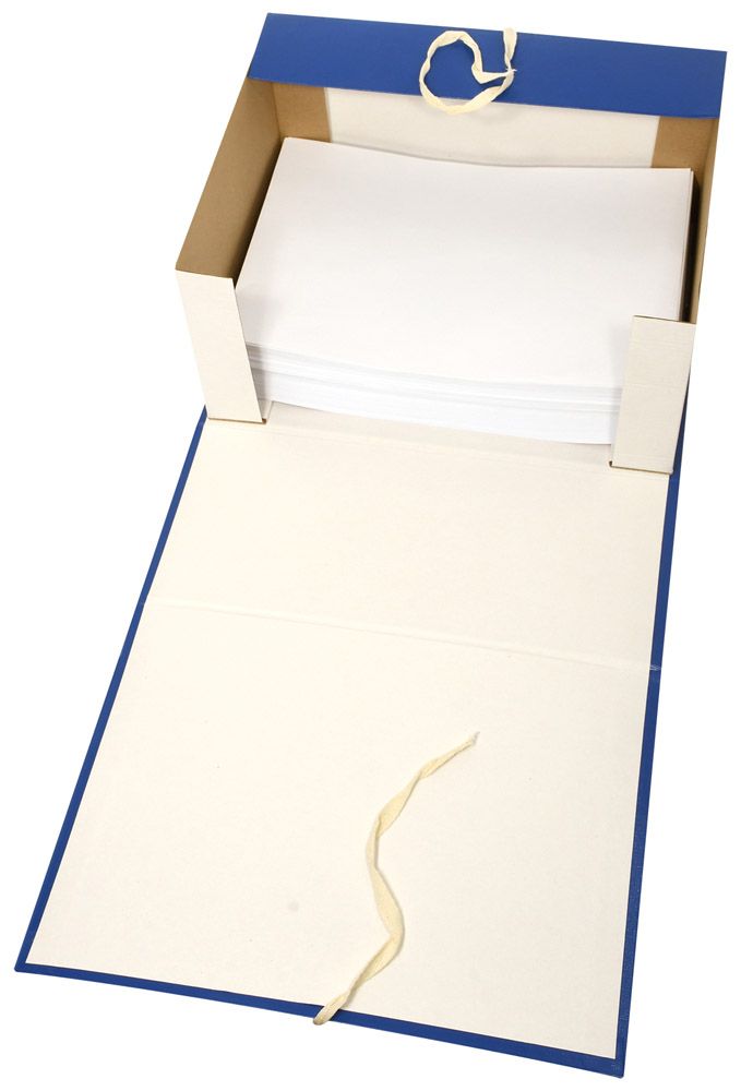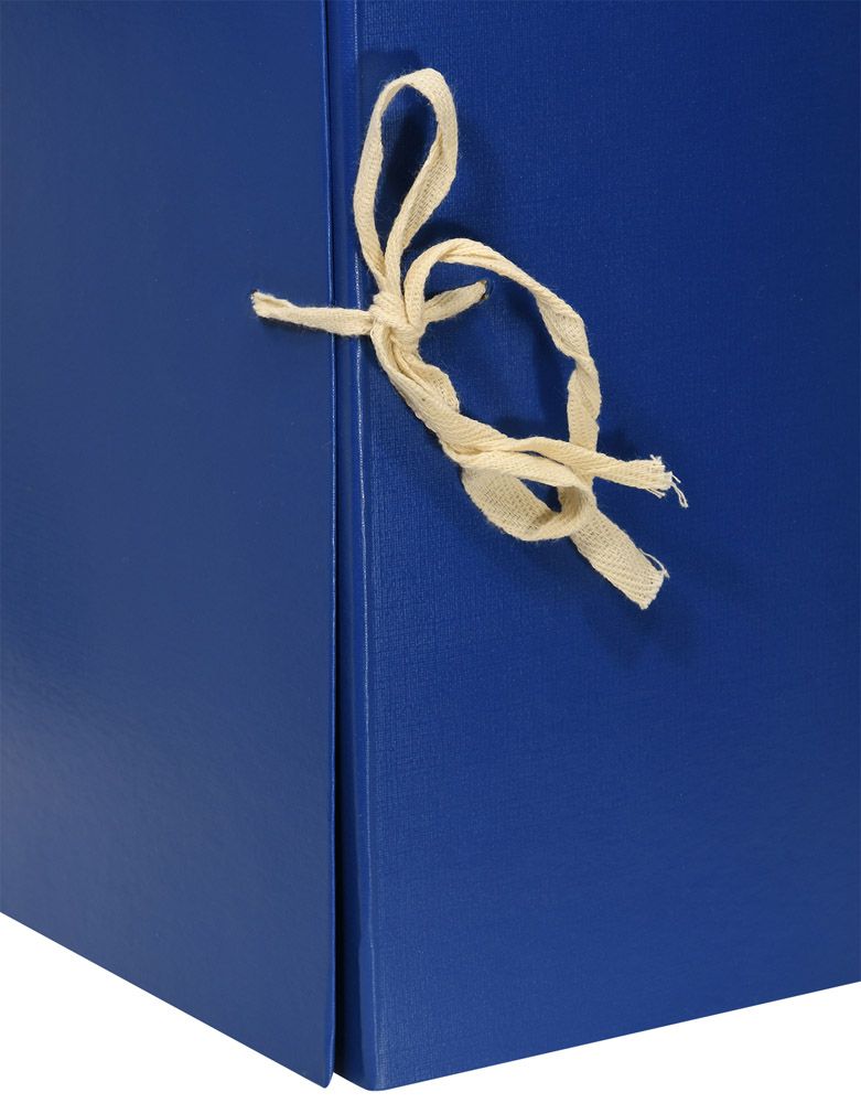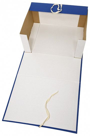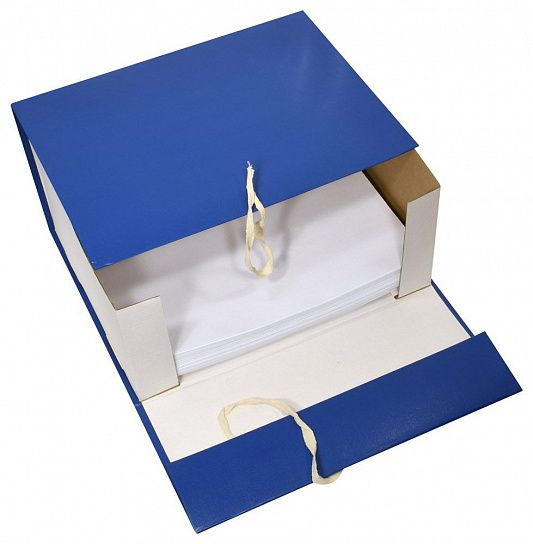 Сборный архивный короб формата А4 с бумвиниловым покрытием. Закрывается клапанами из гофрокартона и двумя завязками, которые фиксируют папку в закрытом положении. На корешке короба имеется цветной стикер для маркировки. Поставляются в разобранном виде.