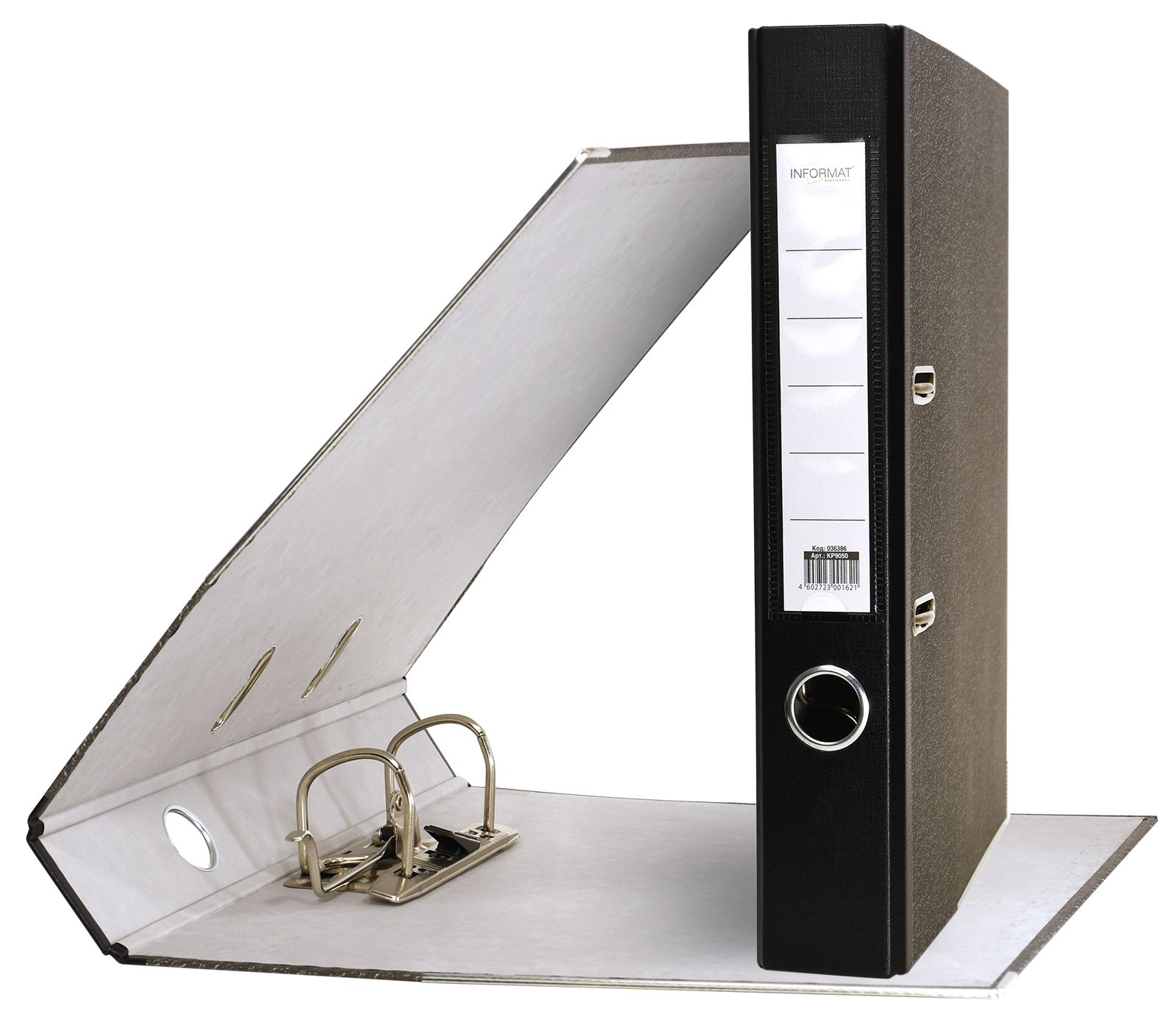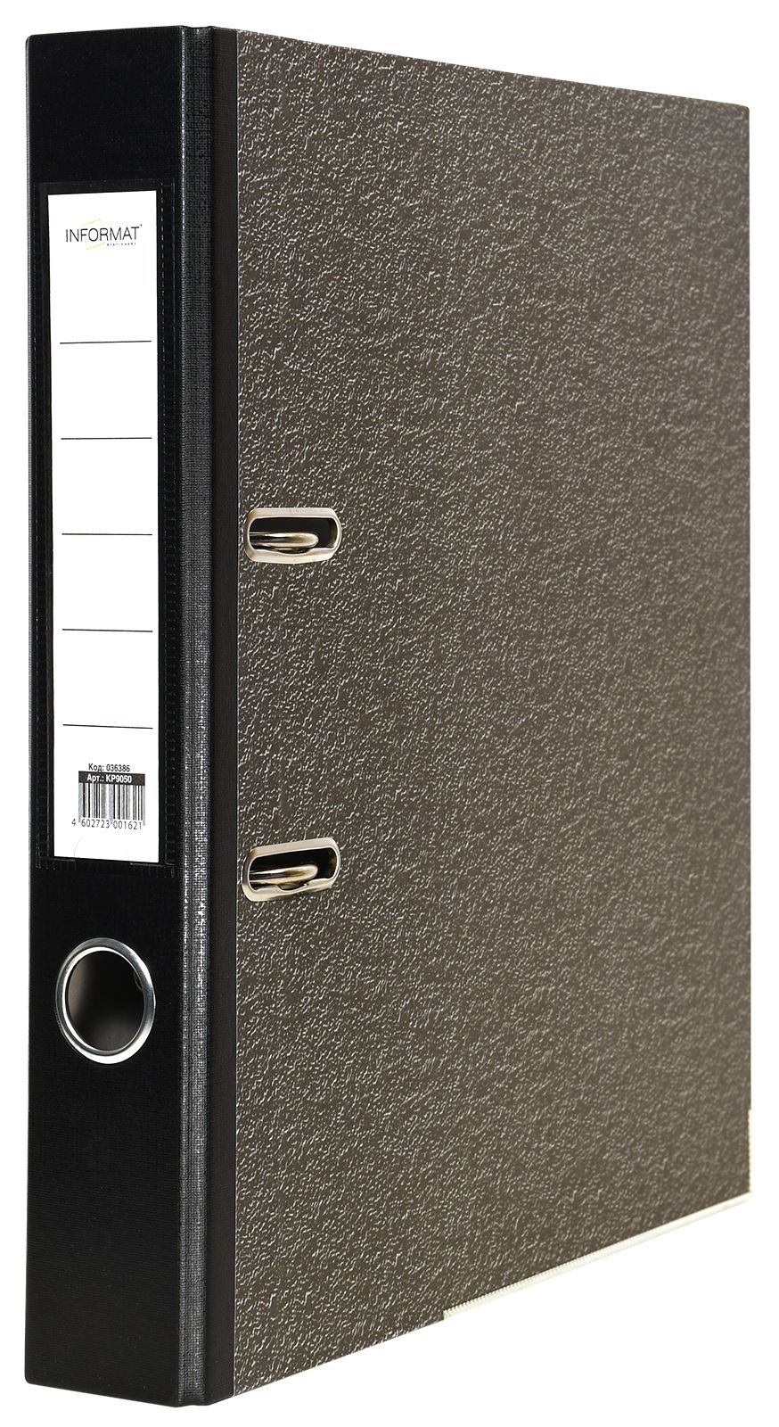 Папка-регистратор INFORMAT формата A4 изготовлена из плотного картона, покрыта с внешней стороны износостойким бумажным покрытием «под мрамор» и PVC корешком для большей прочности и износостойкости. Нижний край папки защищен металлическим кантом, предохраняющим ее от износа. Металлический арочный механизм несъемный. На корешке папки имеется карман со сменной этикеткой для маркировки и кольцо для удобства захвата. Прорези на крышке папки удерживают ее, даже при большом количестве документов.
