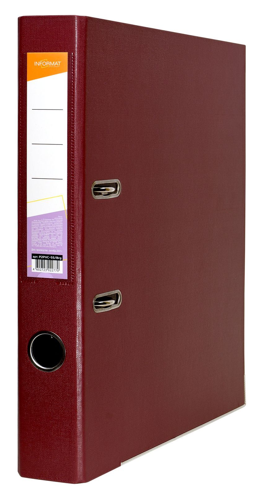 Папка-регистратор формата A4 изготовлена из качественного картона, покрытого с двух сторон покрытием PVC. Нижний край папки защищен металлическим кантом, предохраняющим ее от износа. Металлический арочный механизм съемный. На корешке папки имеется карман со сменной этикеткой для маркировки и кольцо для удобства захвата. Прорези на крышке папки удерживают ее, даже при большом количестве документов.