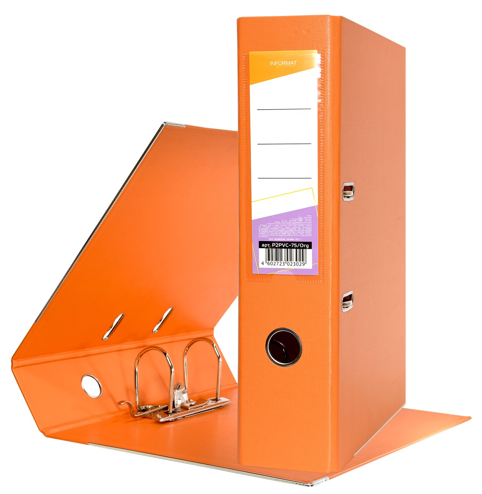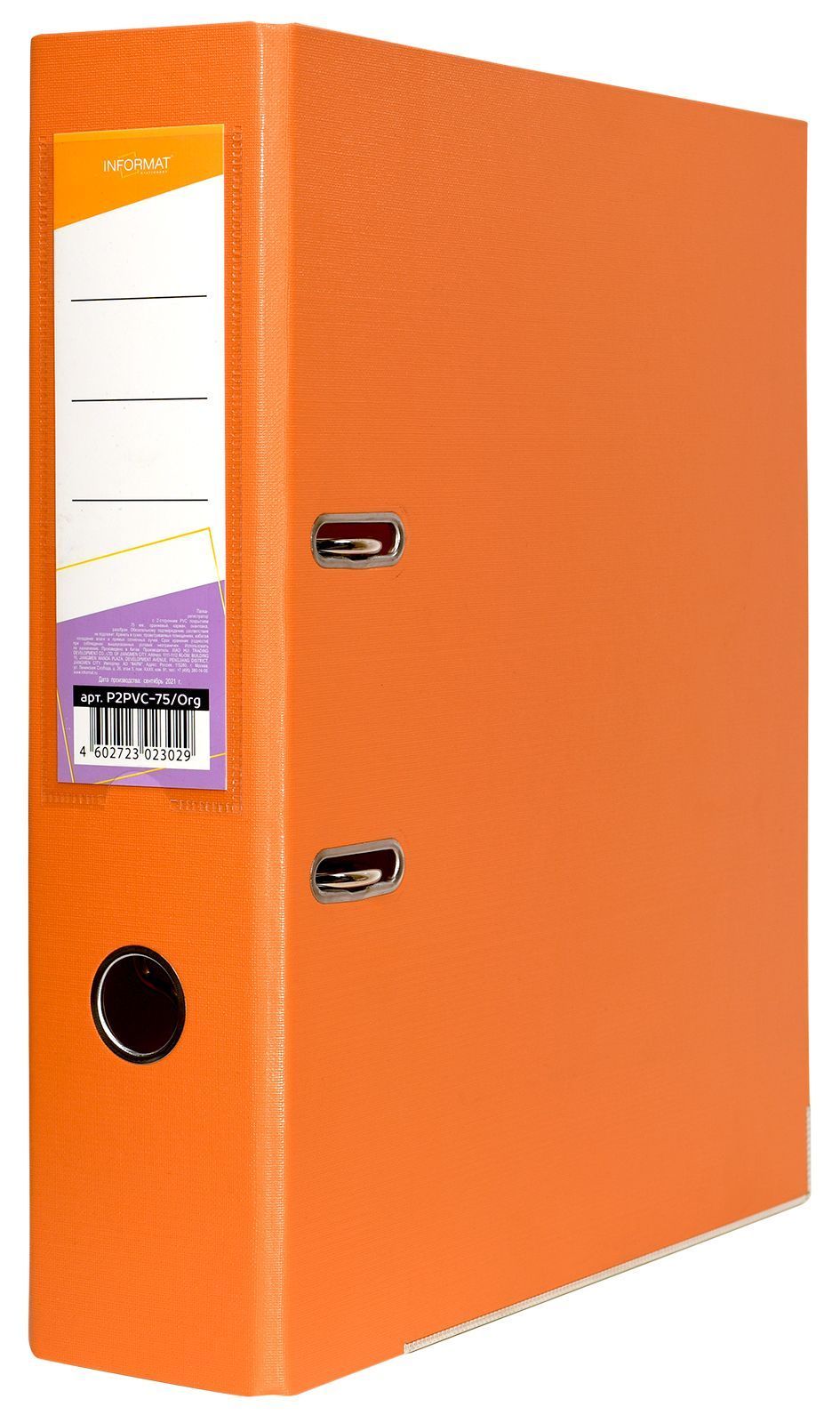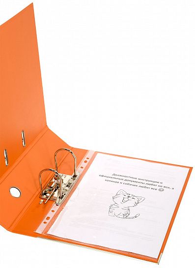 Папка-регистратор формата A4 изготовлена из качественного картона, покрытого с двух сторон покрытием PVC. Нижний край папки защищен металлическим кантом, предохраняющим ее от износа. Металлический арочный механизм съемный. На корешке папки имеется карман со сменной этикеткой для маркировки и кольцо для удобства захвата. Прорези на крышке папки удерживают ее, даже при большом количестве документов.