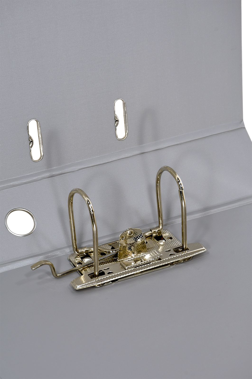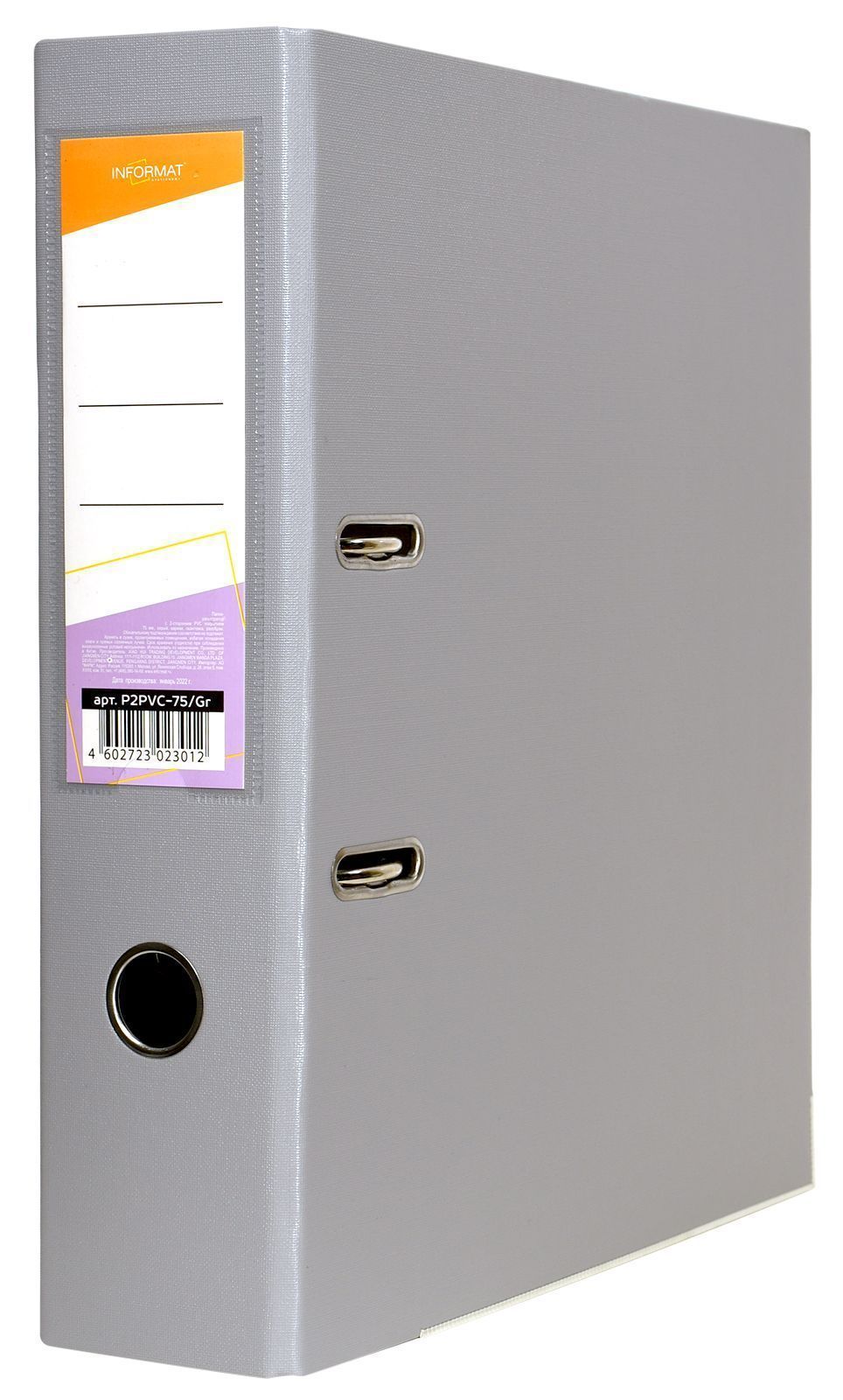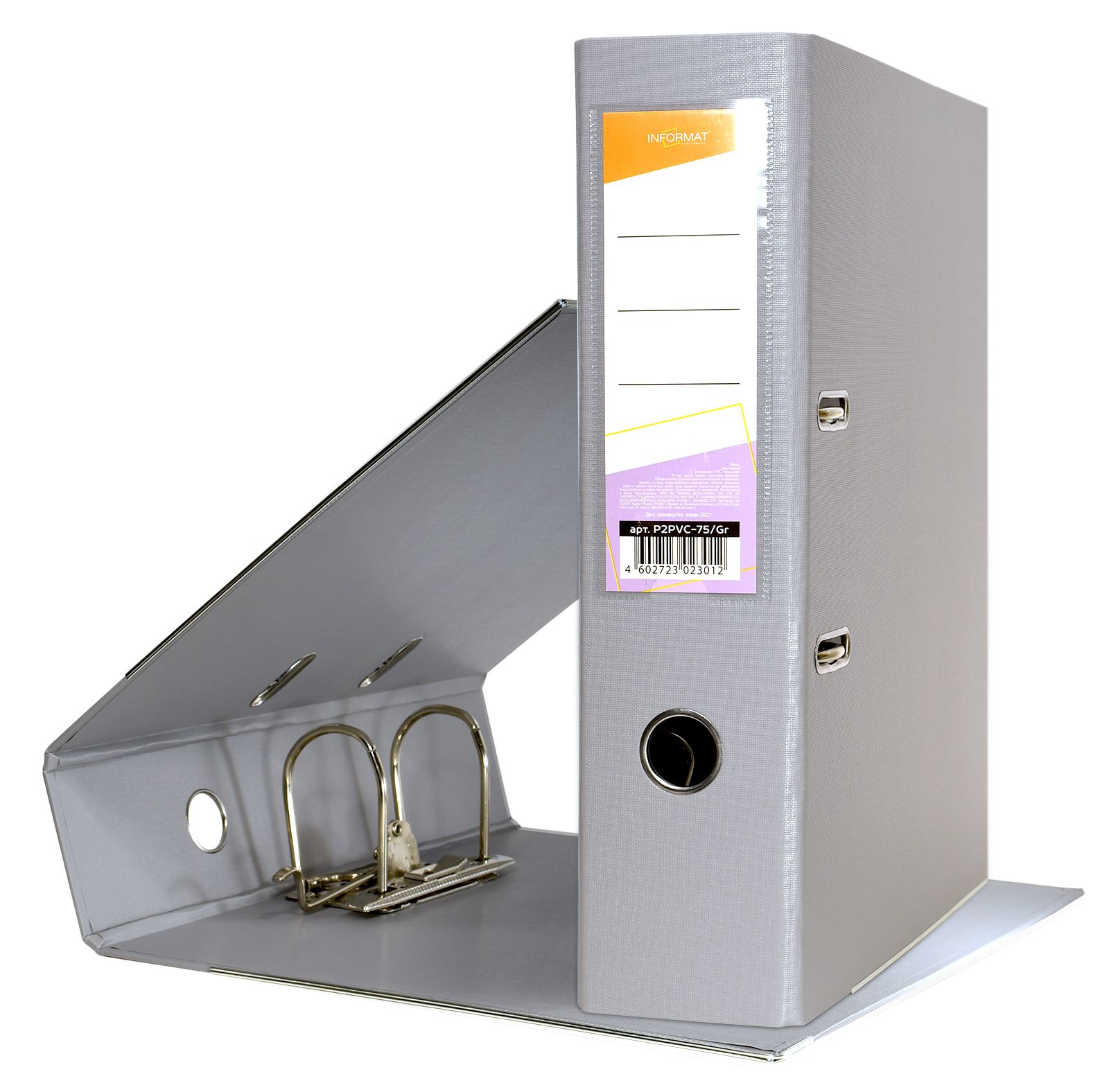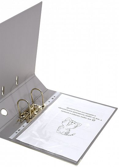 Папка-регистратор формата A4 изготовлена из качественного картона, покрытого с двух сторон покрытием PVC. Нижний край папки защищен металлическим кантом, предохраняющим ее от износа. Металлический арочный механизм съемный. На корешке папки имеется карман со сменной этикеткой для маркировки и кольцо для удобства захвата. Прорези на крышке папки удерживают ее, даже при большом количестве документов.