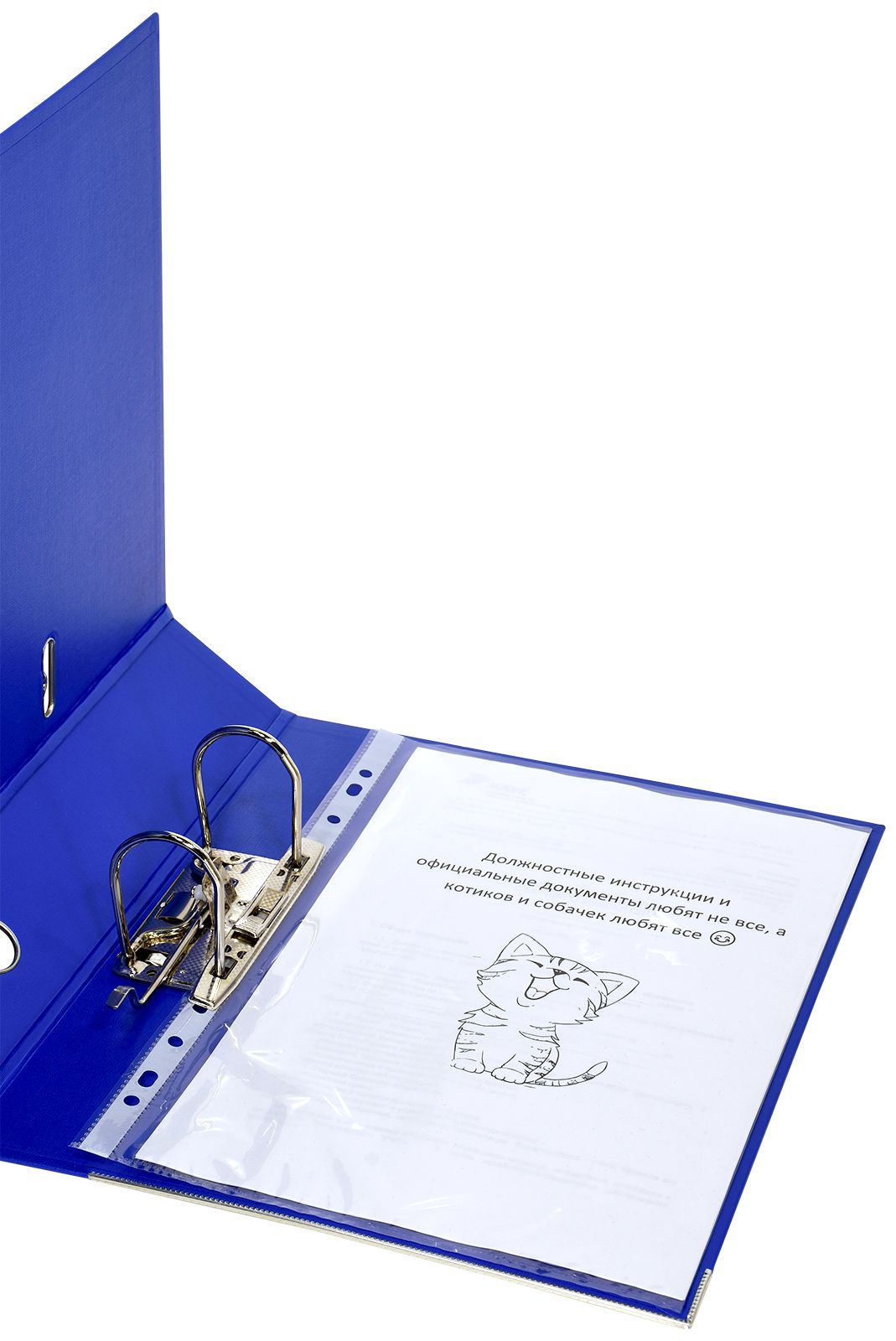 Папка-регистратор формата A4 изготовлена из качественного картона, покрытого с двух сторон покрытием PVC. Нижний край папки защищен металлическим кантом, предохраняющим ее от износа. Металлический арочный механизм съемный. На корешке папки имеется карман со сменной этикеткой для маркировки и кольцо для удобства захвата. Прорези на крышке папки удерживают ее, даже при большом количестве документов.