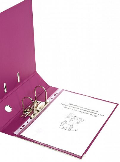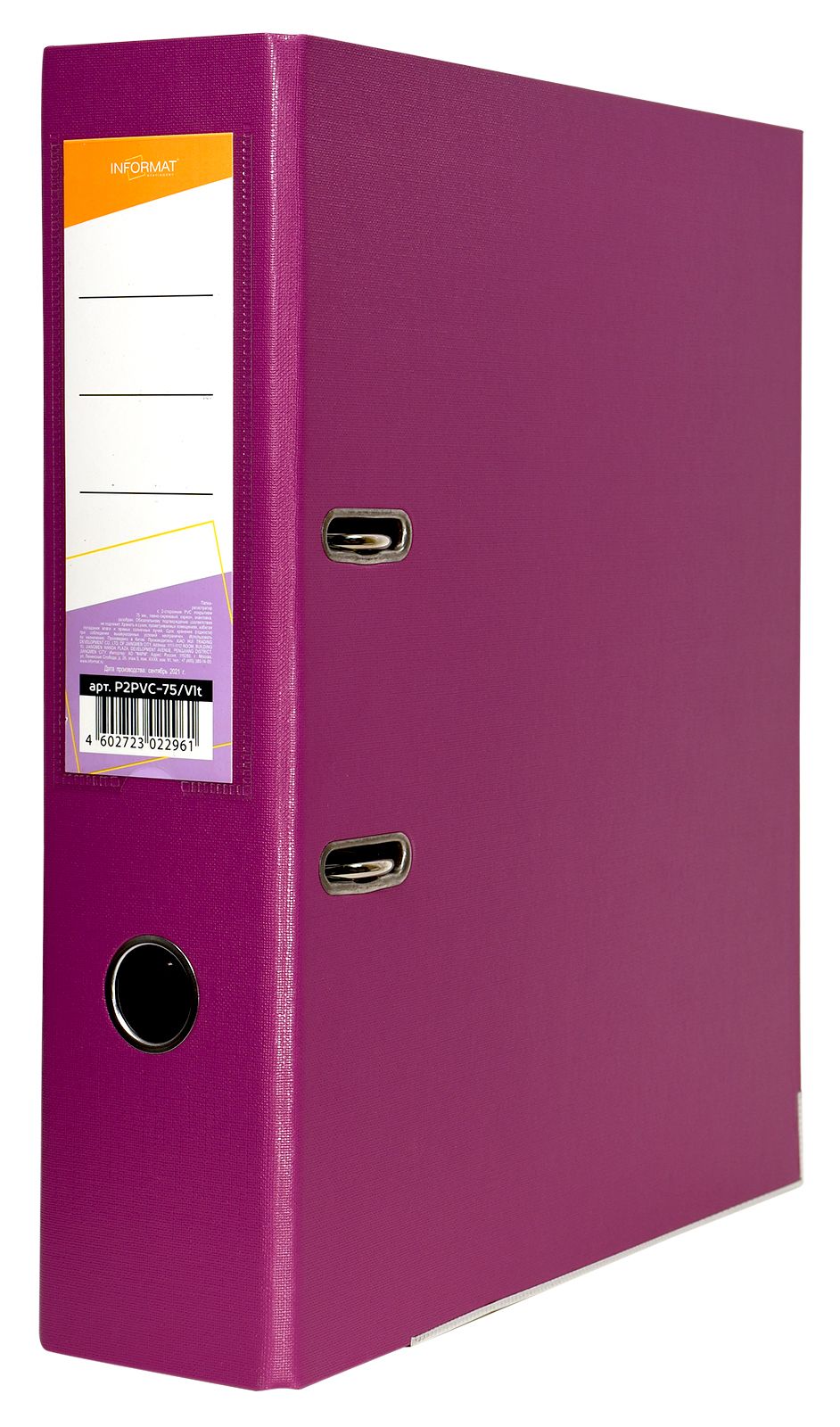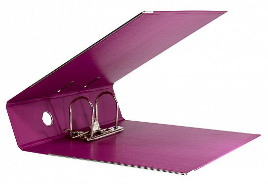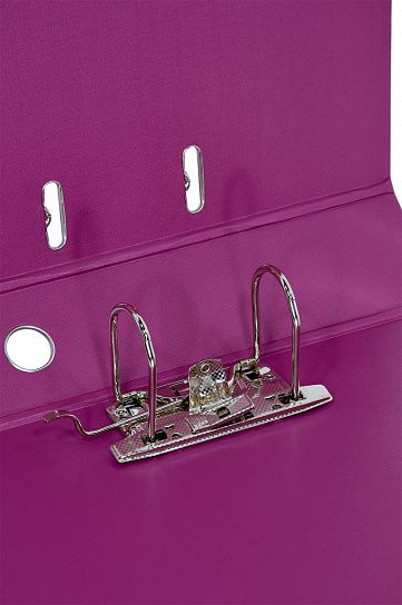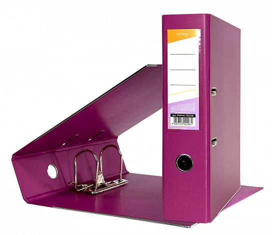 Папка-регистратор формата A4 изготовлена из качественного картона, покрытого с двух сторон покрытием PVC. Нижний край папки защищен металлическим кантом, предохраняющим ее от износа. Металлический арочный механизм съемный. На корешке папки имеется карман со сменной этикеткой для маркировки и кольцо для удобства захвата. Прорези на крышке папки удерживают ее, даже при большом количестве документов.