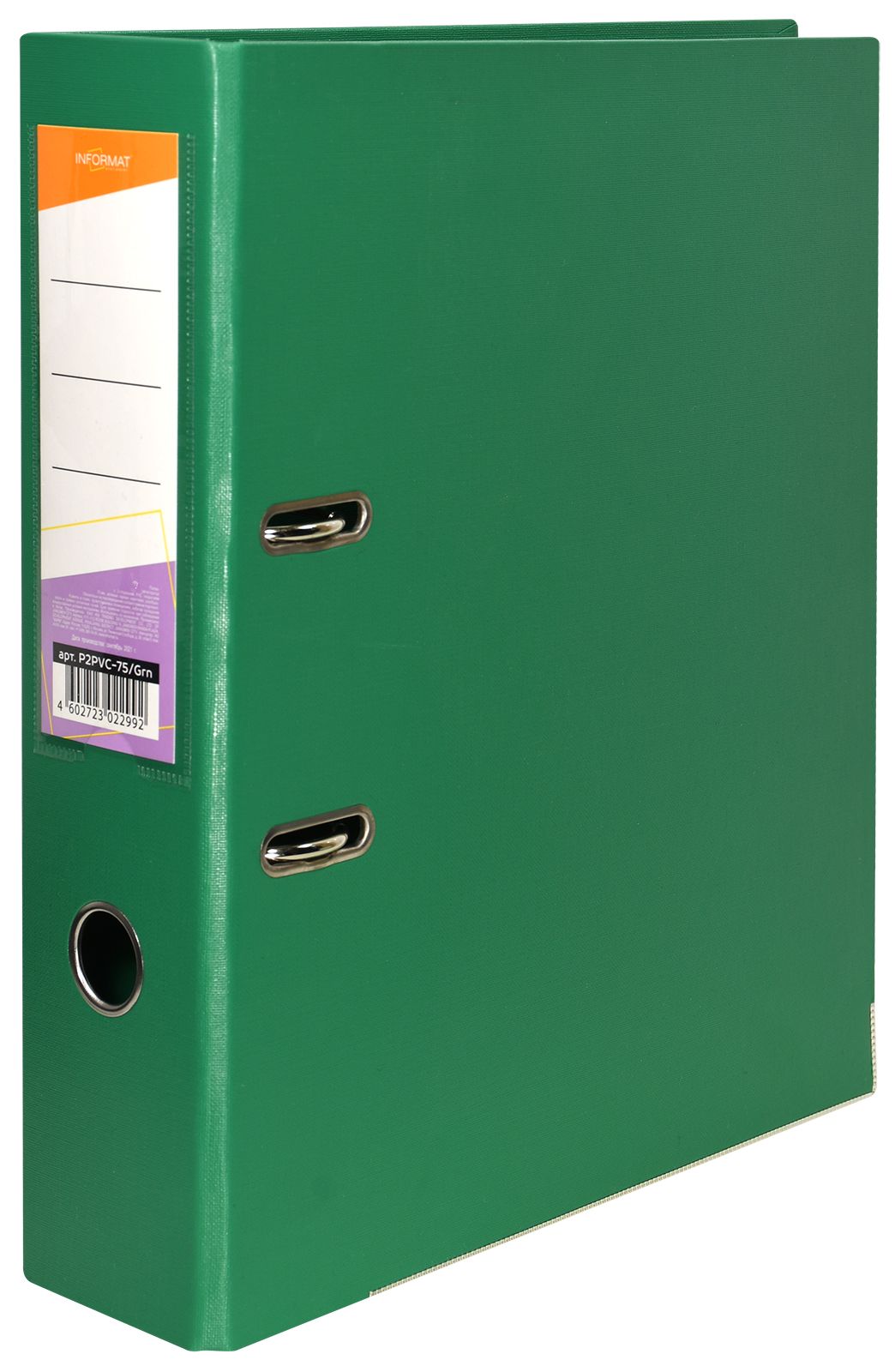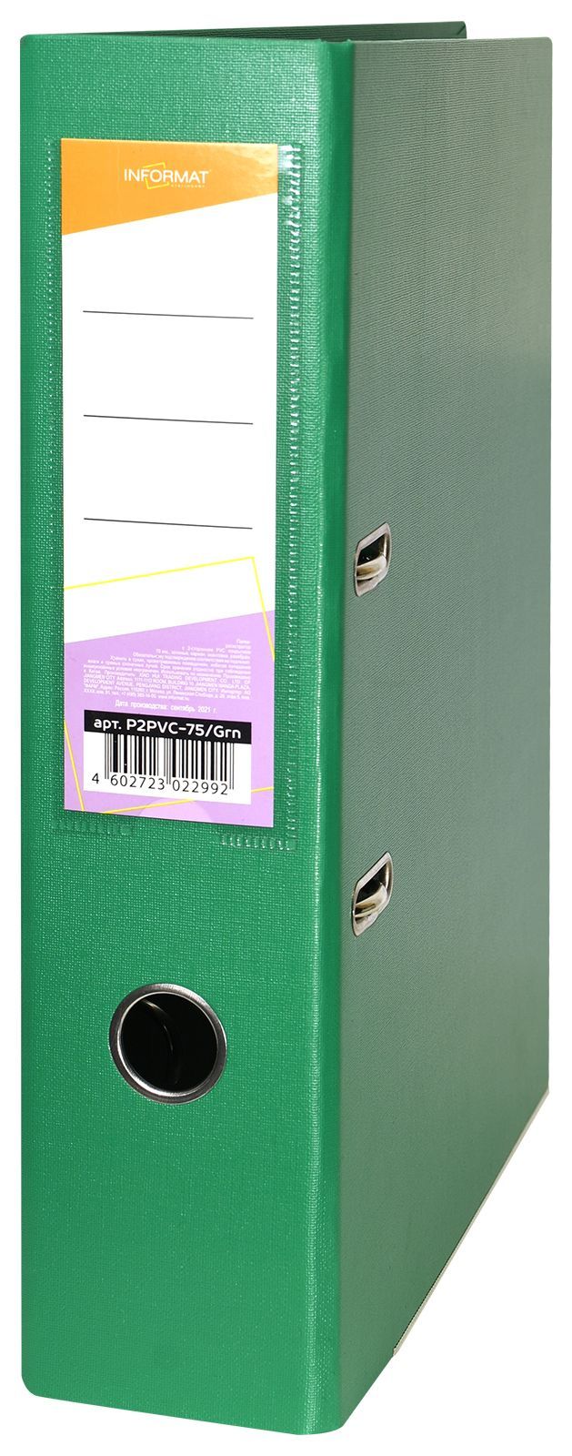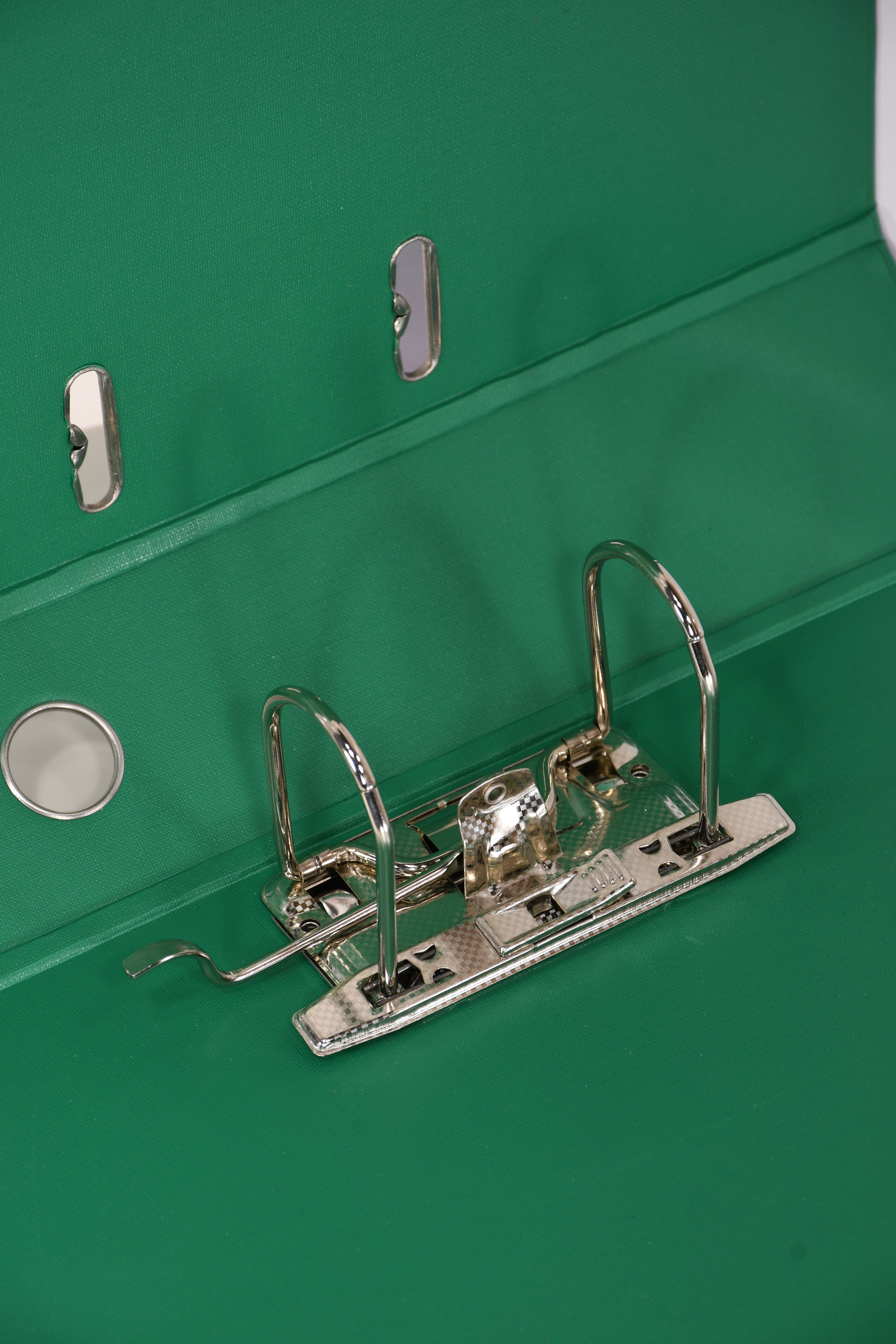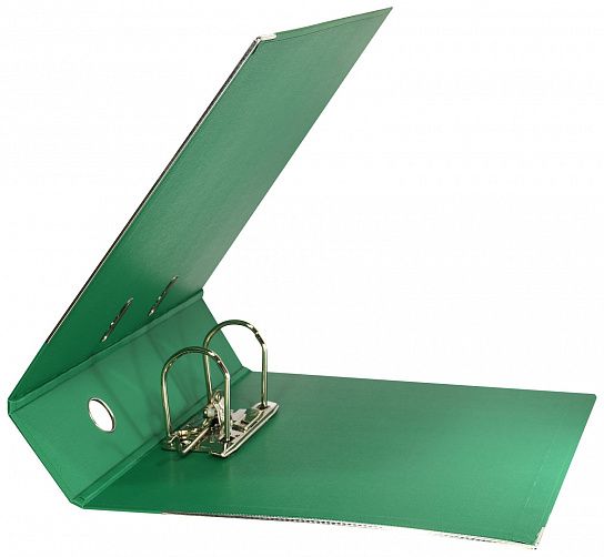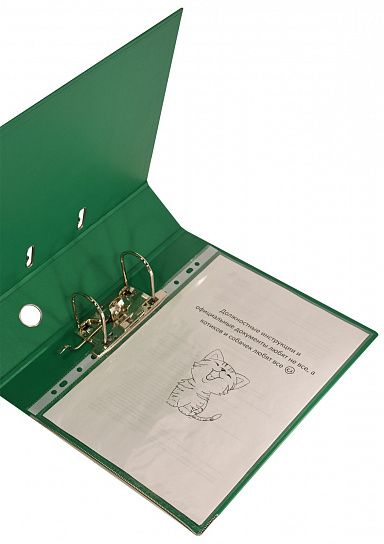 Папка-регистратор формата A4 изготовлена из качественного картона, покрытого с двух сторон покрытием PVC. Нижний край папки защищен металлическим кантом, предохраняющим ее от износа. Металлический арочный механизм съемный. На корешке папки имеется карман со сменной этикеткой для маркировки и кольцо для удобства захвата. Прорези на крышке папки удерживают ее, даже при большом количестве документов.