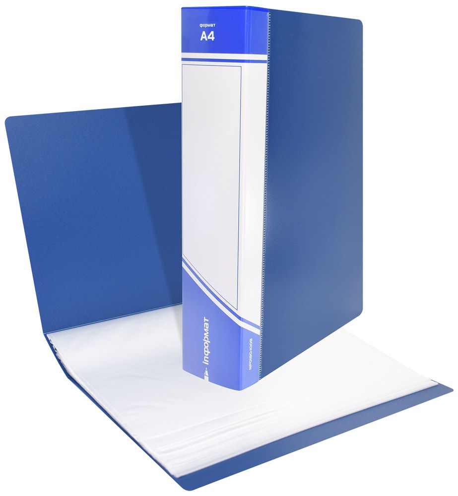 Прочная папка формата A4 из высококачественного пластика с прозрачными карманами-файлами. Внутренние файлы плотно закреплены в корешке папки. Имеет прозрачный карман с вкладышем для маркировки. Толщина пластика — 800 мкм, 100 файлов.